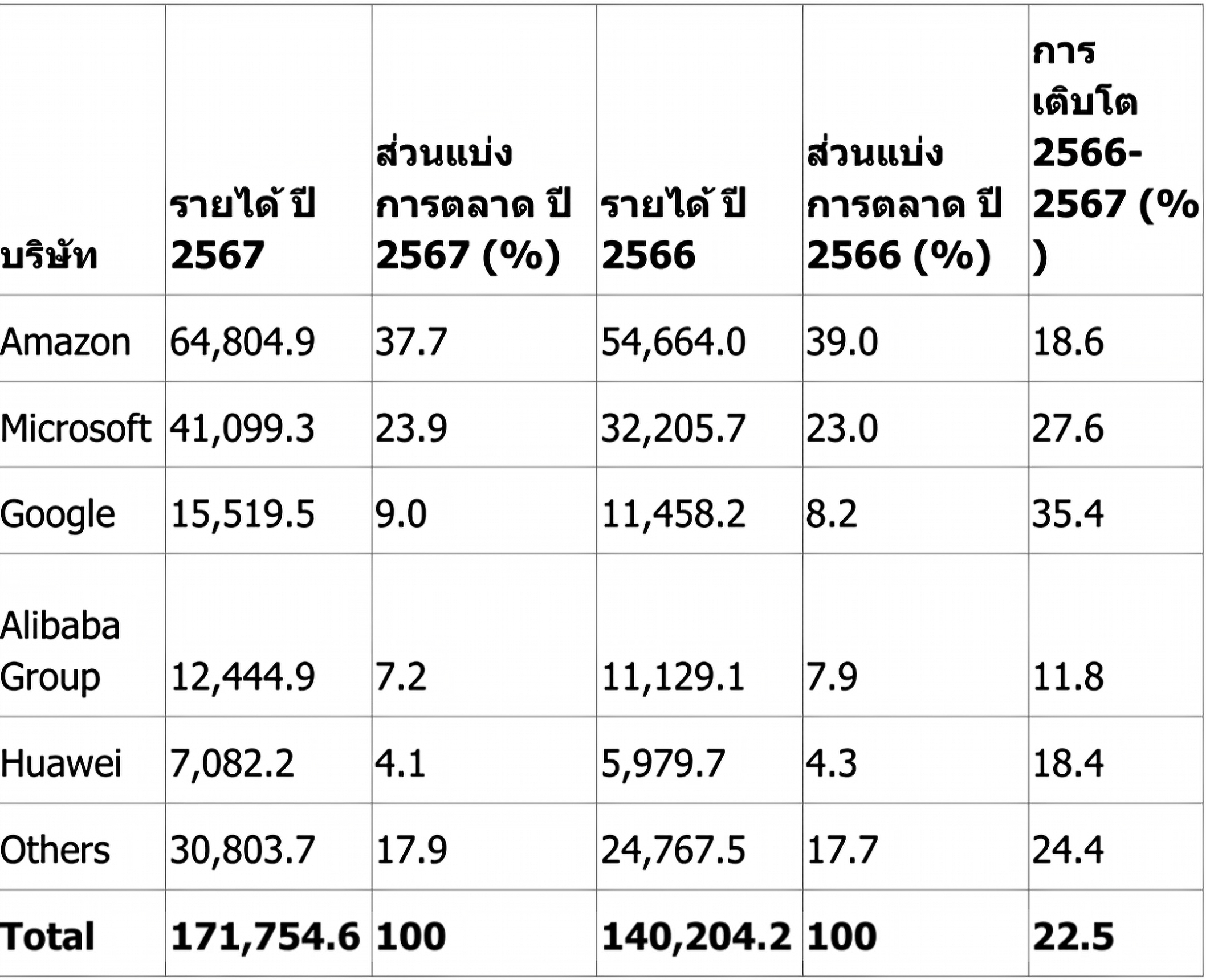 พันล้านดอลลาร์สหรัฐฯ และมีส่วนแบ่งตลาด 37.7% ตามด้วย Microsoft ที่มีส่วนแบ่งตลาด 23.9% (ดูตาราง 1) Google, Alibaba Group และ Huawei