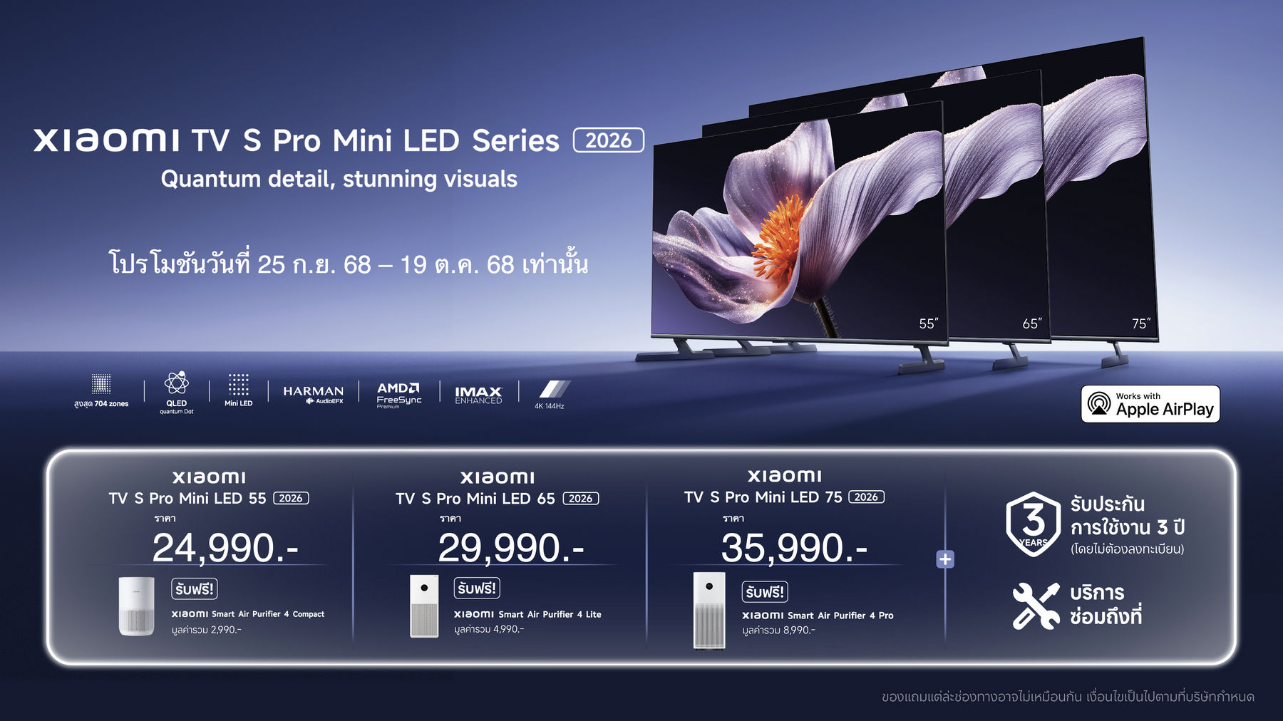 ทีวีอัจฉริยะ Xiaomi TV S Pro Mini LED Series 2026 วางจำหน่ายในประเทศไทยแล้ววันนี้ โดยมีขนาดหน้าจอให้เลือก 3 ขนาด ได้แก่ 75 นิ้ว, 65 นิ้ว และ 55 นิ้ว16 ที่ Xiaomi Store, ร้านตัวแทนจำหน่ายที่ร่วมรายการทั่วประเทศ และช่องทางการจัดจำหน่ายทางออนไลน์ mi.com, Shopee, Lazada และ TikTok Shop