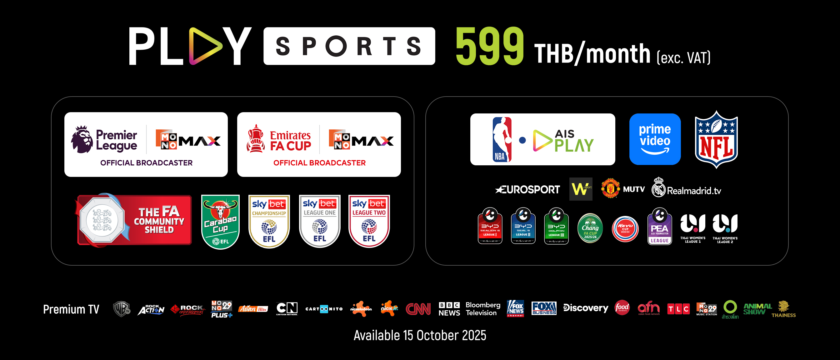 - แพ็กเกจ PLAY SPORTS ราคา 599 บาทต่อเดือน (ไม่รวม VAT) แพ็กเกจใหม่นี้จะเริ่มจำหน่ายในวันที่ 15 ตุลาคม 2568 เป็นต้นไป โดยรวมการรับชมช่องพรีเมียมและรายการกีฬาระดับโลก เช่น พรีเมียร์ลีก, NFL และ NBA ผ่าน AIS PLAY พร้อมคอนเทนต์จาก Prime Video และ Monomax (สมัครกด 67888# โทรออก)