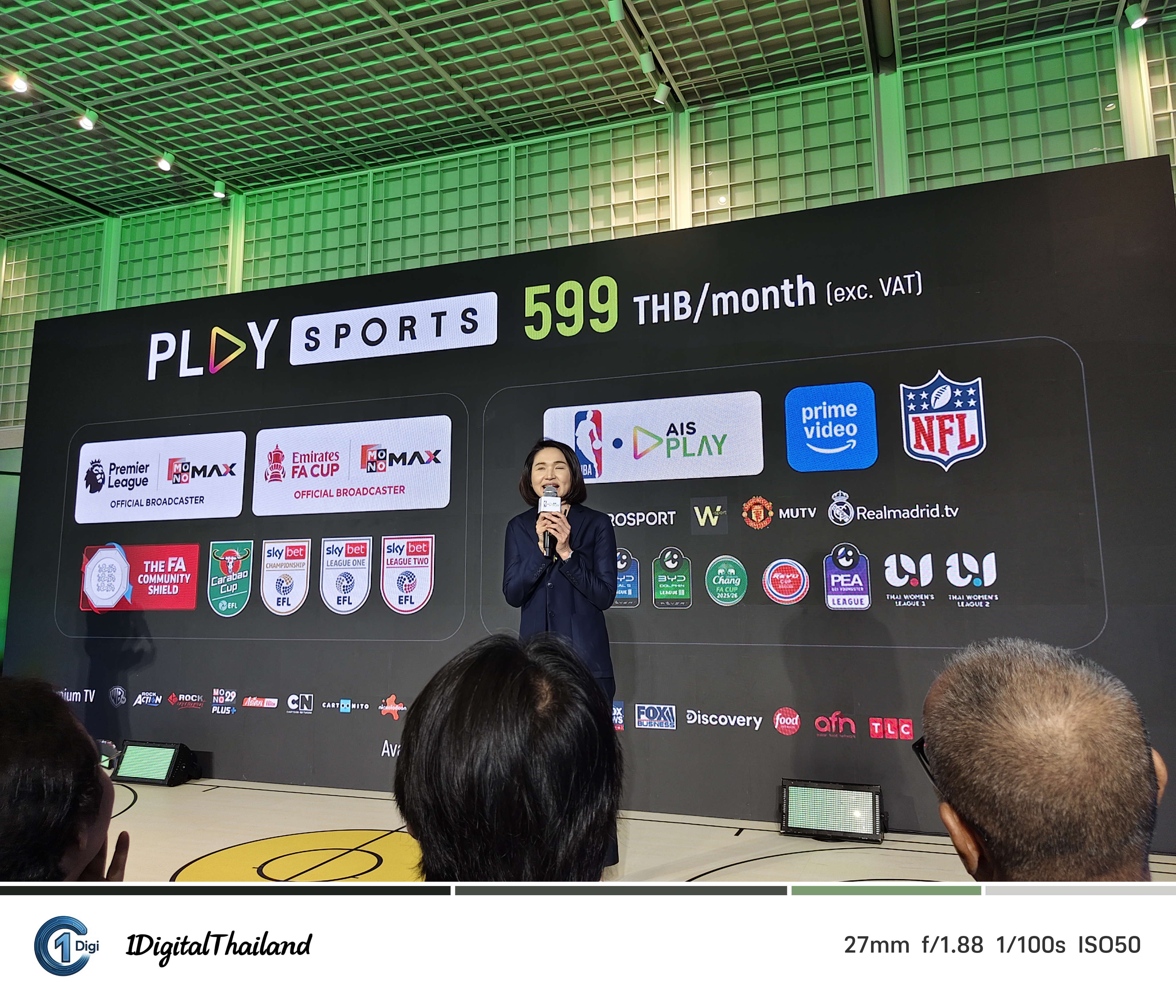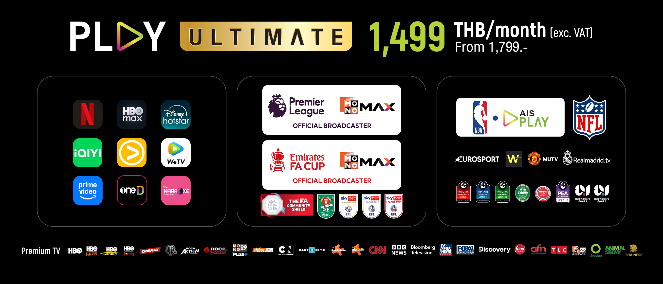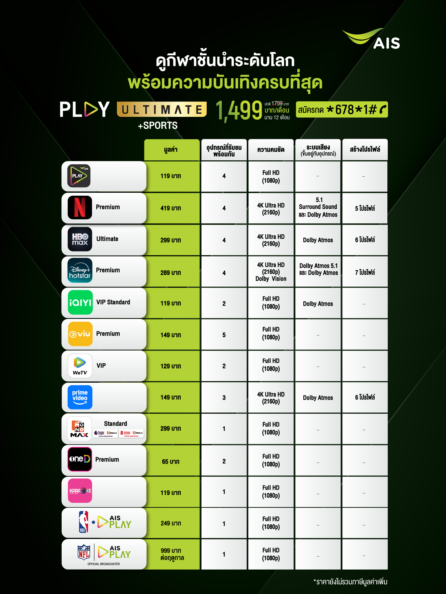 - แพ็กเกจ PLAY ULTIMATE+SPORTS รายเดือน ราคา 1,499 บาทต่อเดือน นาน 12 เดือน หลังจากนั้นค่าบริการ 1,799 บาท (ไม่รวม VAT) แพ็กเกจนี้รวมที่สุดของความบันเทิงและกีฬาทั้งหมดในแพ็กเดียว จัดเต็มช่องพรีเมียมและคอนเทนต์กีฬานำอย่าง พรีเมียร์ลีก, NFL และ NBA บน AIS PLAY รวมถึงความบันเทิงจากสตรีมมิงแพลตฟอร์มชั้นนำมากมาย อาทิ Netflix, HBO Max, Disney+ Hotstar, Prime Video, iQIYI, Viu, WeTV, AIS KARAOKE, Monomax และ oneD (สมัครกด 6781# โทรออก)