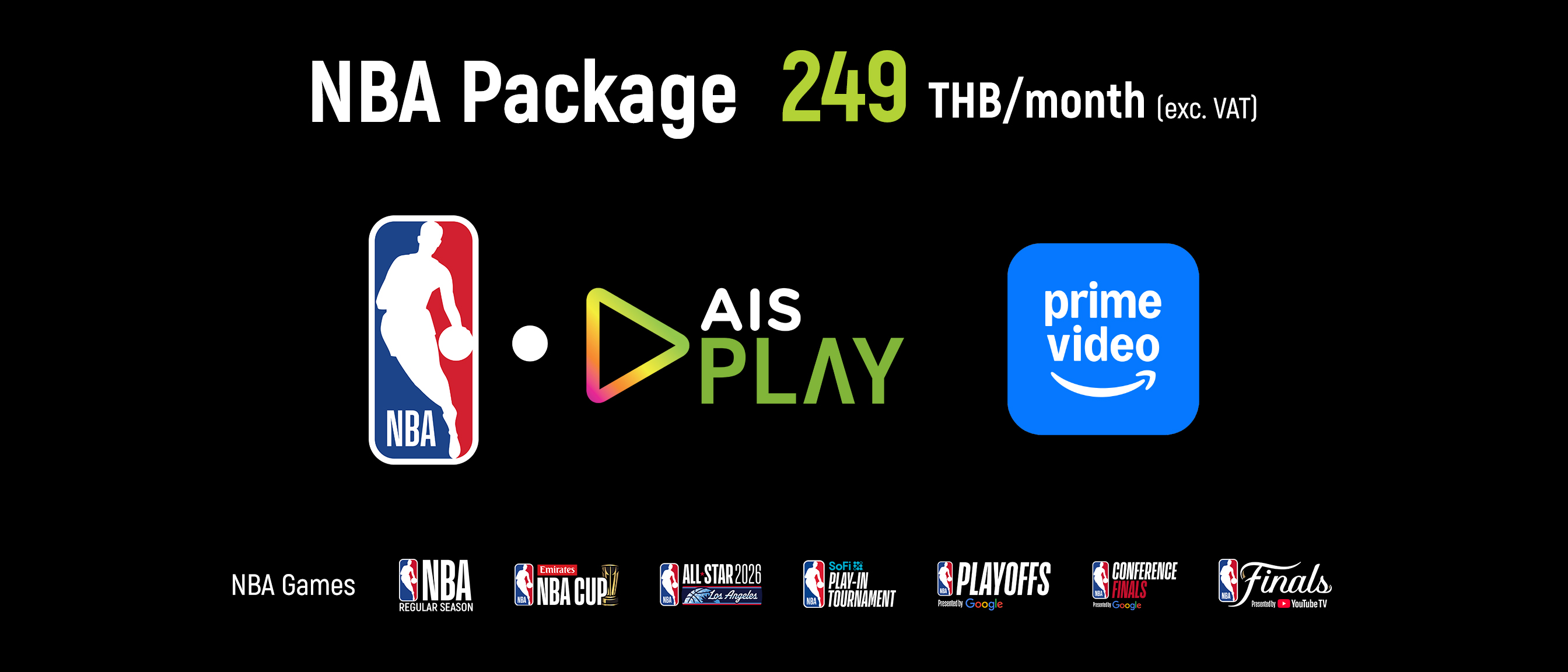 แพ็กเกจ NBA 2025-26 รายเดือน ในราคา 249 บาทต่อเดือน (ไม่รวม VAT) ถือเป็นการรวมสิทธิ์การถ่ายทอดสดจากทั้ง NBA และ Prime Video เข้าไว้ด้วยกันอย่างลงตัว ซึ่งนอกจากลูกค้าจะสามารถรับชมการถ่ายทอดสดทุกแมตช์สำคัญ ทั้งฤดูกาลปกติ รอบเพลย์ออฟ และ All-Star Weekend ผ่าน AIS PLAY แล้ว ยังสามารถเข้าถึงความบันเทิงระดับโลกจาก Prime Video พร้อมชมการแข่งขันฤดูกาลปกติและแมตช์ใหญ่สุดเอ็กซ์คลูซีฟ อาทิ Emirates NBA Cup, Play-In Tournament, และ NBA Finals สำหรับผู้ที่สนใจสามารถสมัครได้โดยกด 67823# โทรออก (รับชมได้ถึงวันที่ 30 มิถุนายน 2569)