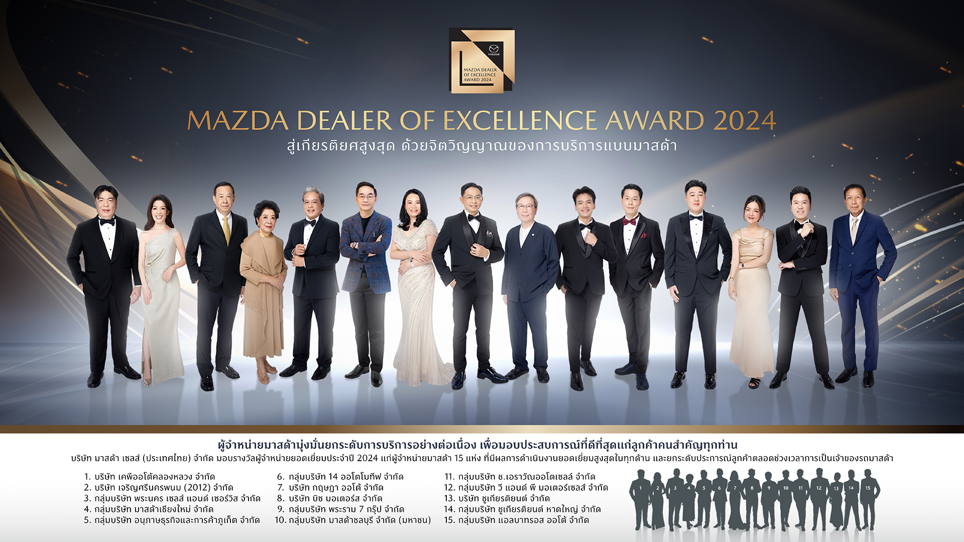 มาสด้าจัดงาน Mazda Dealer of Excellence Awards 2024 เพื่อเชิดชูความสำเร็จของผู้จำหน่ายที่มีผลการดำเนินงานยอดเยี่ยมตลอดปี 2567 ภายใต้ธีม “Driven to Distinction ขับเคลื่อนสู่ความเป็นหนึ่ง ด้วยความแตกต่างเหนือระดับ” ถ่ายทอดความเป็นเลิศอันเกิดจากการร่วมแรงร่วมใจเป็นหนึ่งเดียวกัน ตั้งมั่นด้วยปณิธานอันแน่วแน่คือการส่งมอบประสบการณ์ที่ดีที่สุดให้กับลูกค้า พร้อมมอบรางวัลทีมงานฝ่ายขายและฝ่ายบริการยอดเยี่ยมแห่งปี หรือ Mazda Guild Sales and Servies Awards 2024 ให้กับทีมงานของผู้จำหน่ายที่มีผลการดำเนินงานดีที่สุดตลอดปีที่ผ่านมา เพื่อสร้างขวัญกำลังใจ และแทนคำขอบคุณที่เป็นกำลังสำคัญในการขับเคลื่อนธุรกิจ ด้วยการส่งมอบการบริการที่เป็นเลิศให้กับลูกค้ามาสด้าในประเทศไทย โดยงานฯ จัดขึ้นที่โรงแรม โฟร์ซีซั่นส์ ริมแม่น้ำเจ้าพระยา กรุงเทพฯ เมื่อเร็วๆ นี้ โดยมีผู้บริหารจากมาสด้า เซลส์ ประเทศไทย ผู้จำหน่ายมาสด้าทั่วประเทศ และทีมงานของผู้จำหน่ายเข้าร่วมงาน เพื่อร่วมแสดงความยินดี ภายใต้บรรยากาศที่เต็มไปด้วยความอบอุ่นและเป็นกันเอง