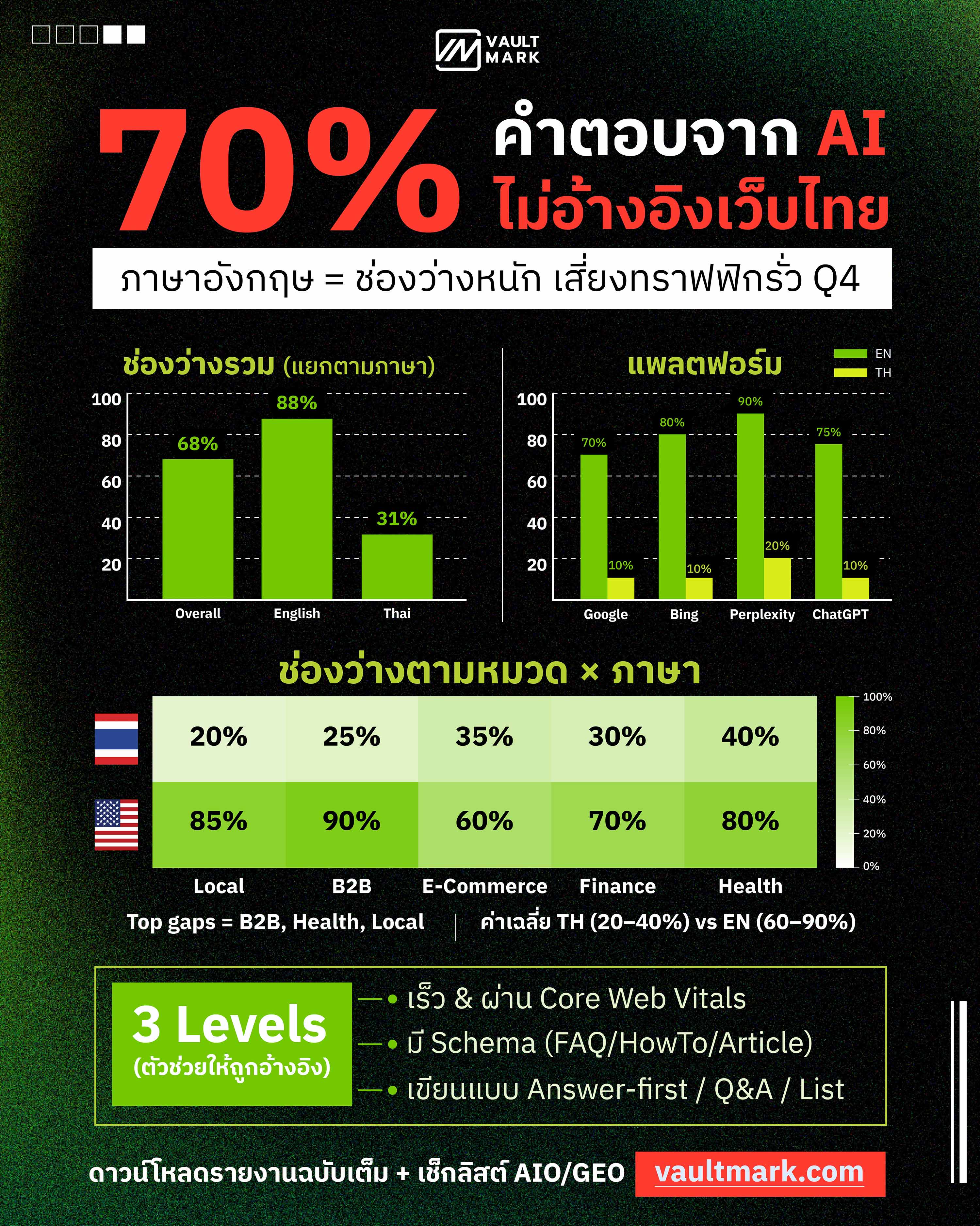 • ช่องว่างรวม: 70% ของคำตอบจาก AI ไม่มีการอ้างอิงโดเมนไทย