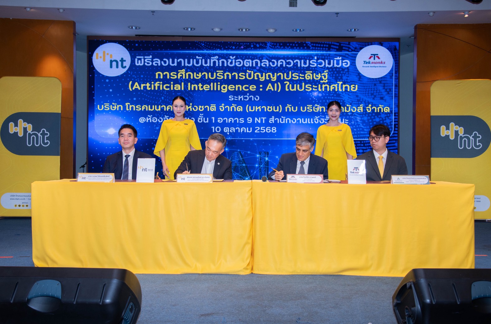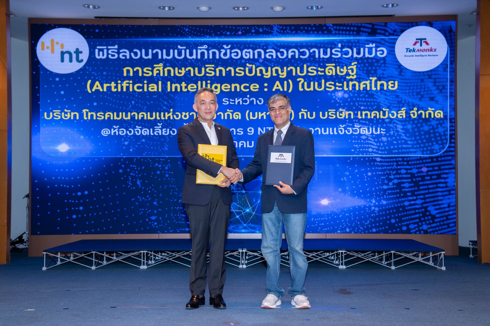 พันเอก สรรพชัยย์ หุวะนันทน์ กรรมการผู้จัดการใหญ่ บริษัท โทรคมนาคมแห่งชาติ จำกัด (มหาชน) (NT) และ โรห์อิท กาพอร์ ประธานบริษัท เทคมังส์ จำกัด (TekMonks) ลงนามบันทึกข้อตกลงความร่วมมือ (MOU) ศึกษาบริการปัญญาประดิษฐ์ (Artificial Intelligence: AI) ในประเทศไทย มุ่งเป้าหมายพัฒนาโซลูชันด้าน AI โดยมี ดร.วงกต วิจักขณ์สังสิทธิ์ รองกรรมการผู้จัดการใหญ่ สายงานดิจิทัล NT และ ปัณณวิชญ์ นวลพรหมสกุลกรรมการผู้จัดการ บริษัท เอดี โปร เทคโนโลยี จำกัด ร่วมงาน ณ อาคาร 9 สำนักงาน NT แจ้งวัฒนะ