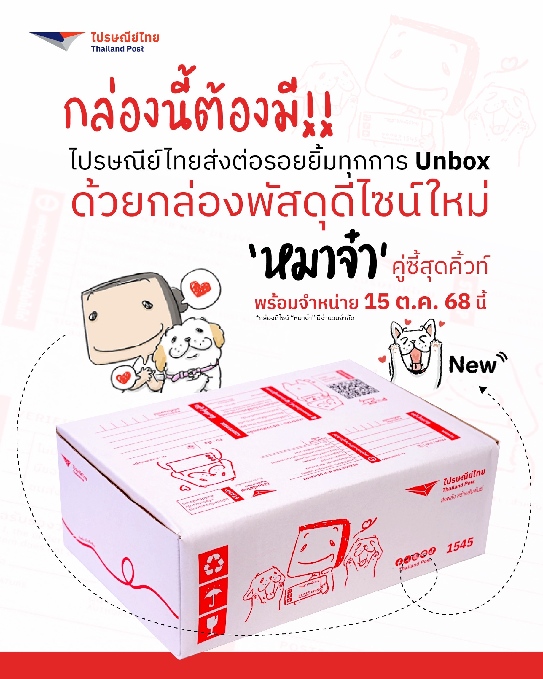 บริษัท ไปรษณีย์ไทย จำกัด เดินหน้าสร้างความสุขและรอยยิ้ม ผ่านทุกการส่ง เปิดตัวการคอลแลบพิเศษกับเพจ “หมาจ๋า” เจ้าของคาแรกเตอร์สุนัขแสนอบอุ่นที่ครองใจแฟนคลับบนโลกออนไลน์มา สู่ผลงานดีไซน์พิเศษ “กล่องไปรษณีย์ลายหมาจ๋า” รุ่นลิมิเต็ด เอดิชัน “คู่หู คู่ซี้ คอลเลคชัน Post & Paw Collection” ผสานความเป็นแบรนด์แห่งความผูกพันของไปรษณีย์ไทย เข้ากับเสน่ห์ของคาแรกเตอร์หมาจ๋า ที่ถ่ายทอดเรื่องราวแห่งมิตรภาพระหว่างพี่ไปรฯ กับเพื่อนซี้สี่ขาที่อยู่เคียงข้างกันในทุกเส้นทางการเดินทางของพัสดุ และทุกความรู้สึกที่ส่งต่อถึงกัน