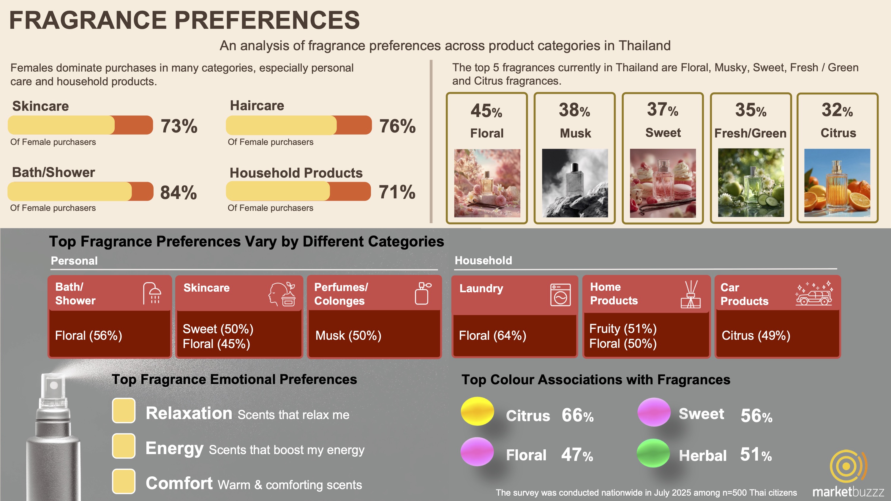ผลการสำรวจพบว่า คนไทยมีความนิยมกลิ่นหอม 5 อันดับแรก ได้แก่ "กลิ่นดอกไม้" เป็นอันดับหนึ่งด้วยคะแนน 45% ตามมาด้วย "กลิ่นมัสก์" (38%) ที่ให้ความรู้สึกอบอุ่น และ "กลิ่นหวาน" (37%) ที่สร้างความรู้สึกสบาย นอกจากนี้ ยังมี "กลิ่นสดชื่นและกลิ่นธรรมชาติ" (35%) และ "กลิ่นซิตรัส" (32%)