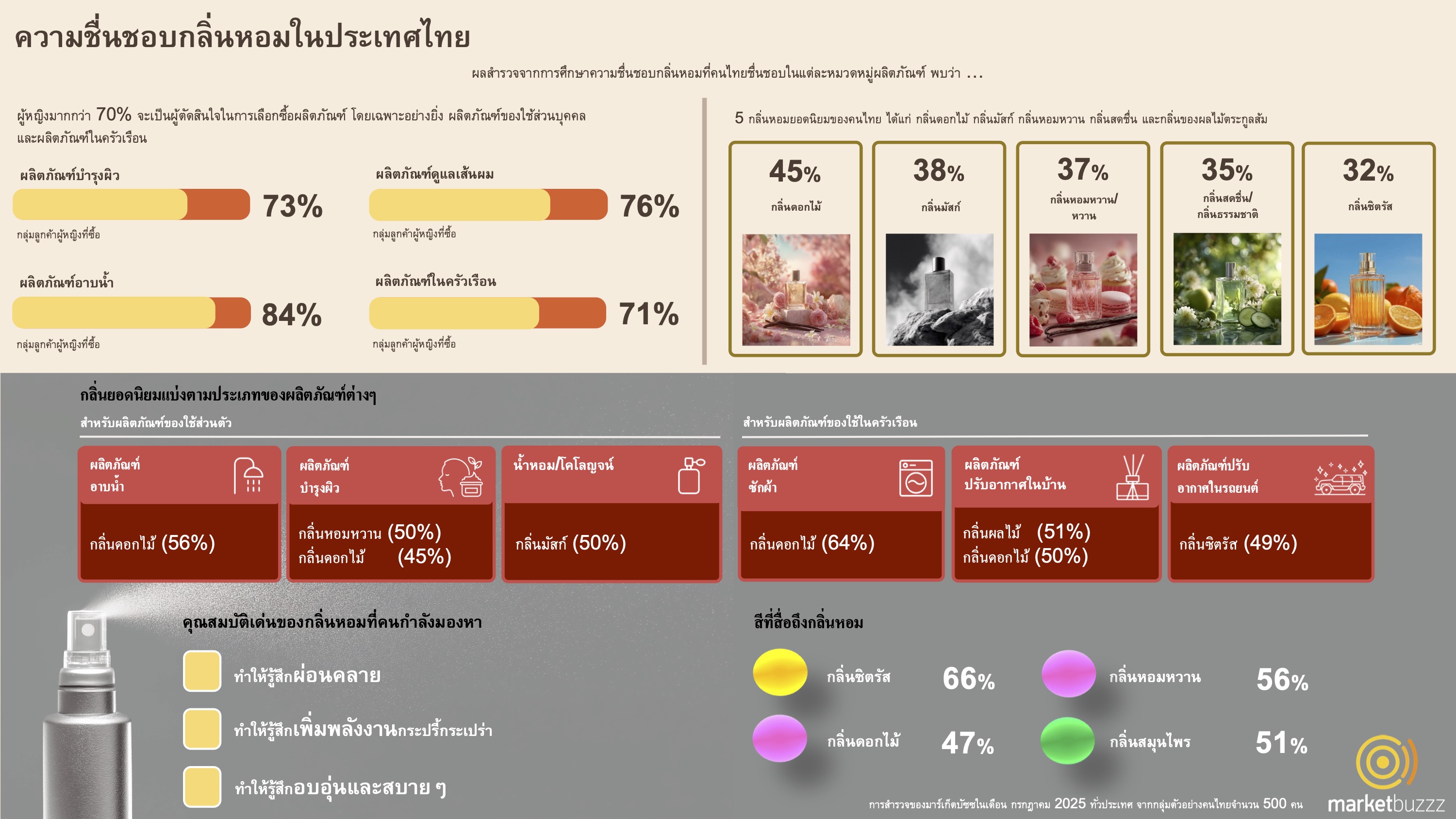 ผลการศึกษาล่าสุดโดยมาร์เก็ตบัซซ ในหัวข้อ ‘ความชื่นชอบกลิ่นหอมในประเทศไทย’ เผยถึงบทบาทของประสาทสัมผัสที่มีต่อพฤติกรรมการซื้อและความชอบกลิ่นที่แตกต่างกันไปในแต่ละประเภทผลิตภัณฑ์ จากการสำรวจคนไทย 500 คน พบว่าคนไทยให้ความสำคัญอย่างมากกับสิ่งเร้าทางประสาทสัมผัส โดยเฉพาะ “กลิ่น” และ “สี” ซึ่งเป็นปัจจัยสำคัญที่กำหนดการเลือกซื้อสินค้าในแต่ละประเภท