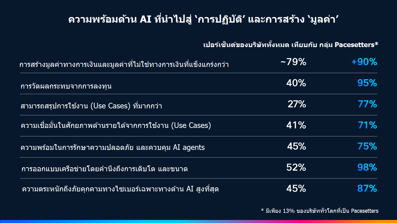 ความได้เปรียบที่ยั่งยืนของ กลุ่มผู้นำที่มีความพร้อมด้าน AI (Pacesetters) ชี้ให้เห็นถึงรูปแบบใหม่ของความยืดหยุ่นทางธุรกิจ (Resilience) นั่นก็คือ การใช้แนวทางเชิงระบบที่เป็นระเบียบ (disciplined, system-level approach) ที่สร้างความสมดุลระหว่างตัวขับเคลื่อนเชิงกลยุทธ์ กับข้อมูลและโครงสร้างพื้นฐานที่จำเป็น เพื่อให้ก้าวทันวิวัฒนาการที่รวดเร็วของ AI พวกเขากำลังออกแบบสถาปัตยกรรมสำหรับอนาคต โดย 98% ของกลุ่มนี้ออกแบบเครือข่ายของตนให้พร้อมรับมือกับการเติบโต การขยายขนาด และความซับซ้อนของ AI ในขณะที่บริษัทในประเทศไทยทำได้เพียง 52%