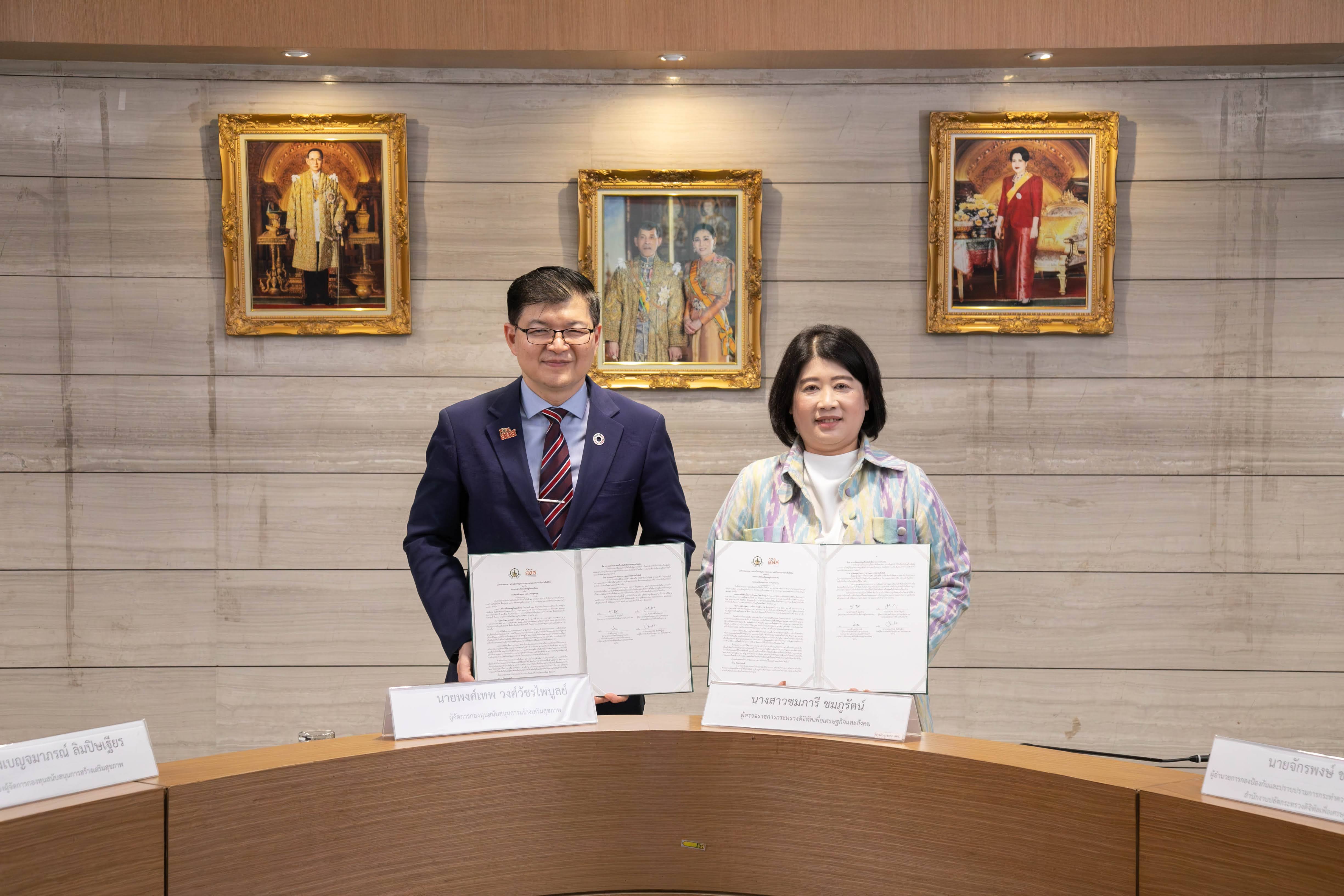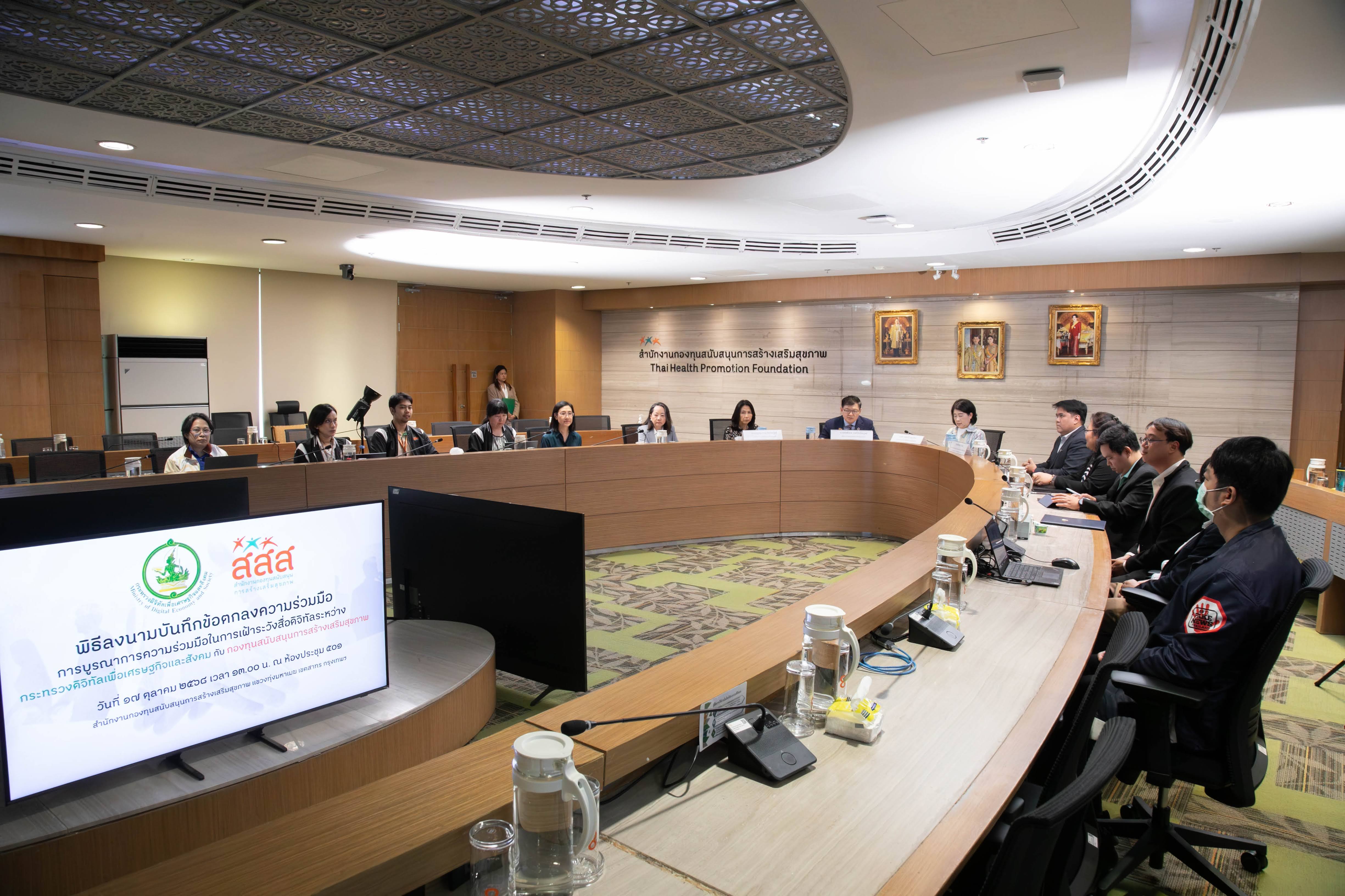 กระทรวงดิจิทัลเพื่อเศรษฐกิจและสังคม (ดีอี) ร่วมกับสำนักงานกองทุนสนับสนุนการสร้างเสริมสุขภาพ (สสส.) จัดพิธีลงนามบันทึกข้อตกลงความร่วมมือการบูรณาการความร่วมมือในการเฝ้าระวังสื่อดิจิทัล เพื่อผลักดันนโยบายและมาตรการคุ้มครองผู้ใช้สื่อออนไลน์ พร้อมสร้างกลไกการสื่อสารที่เข้มแข็ง เพื่อยกระดับการรู้เท่าทันสื่อของประชาชน ณ อาคารศูนย์เรียนรู้สุขภาวะ กรุงเทพฯ