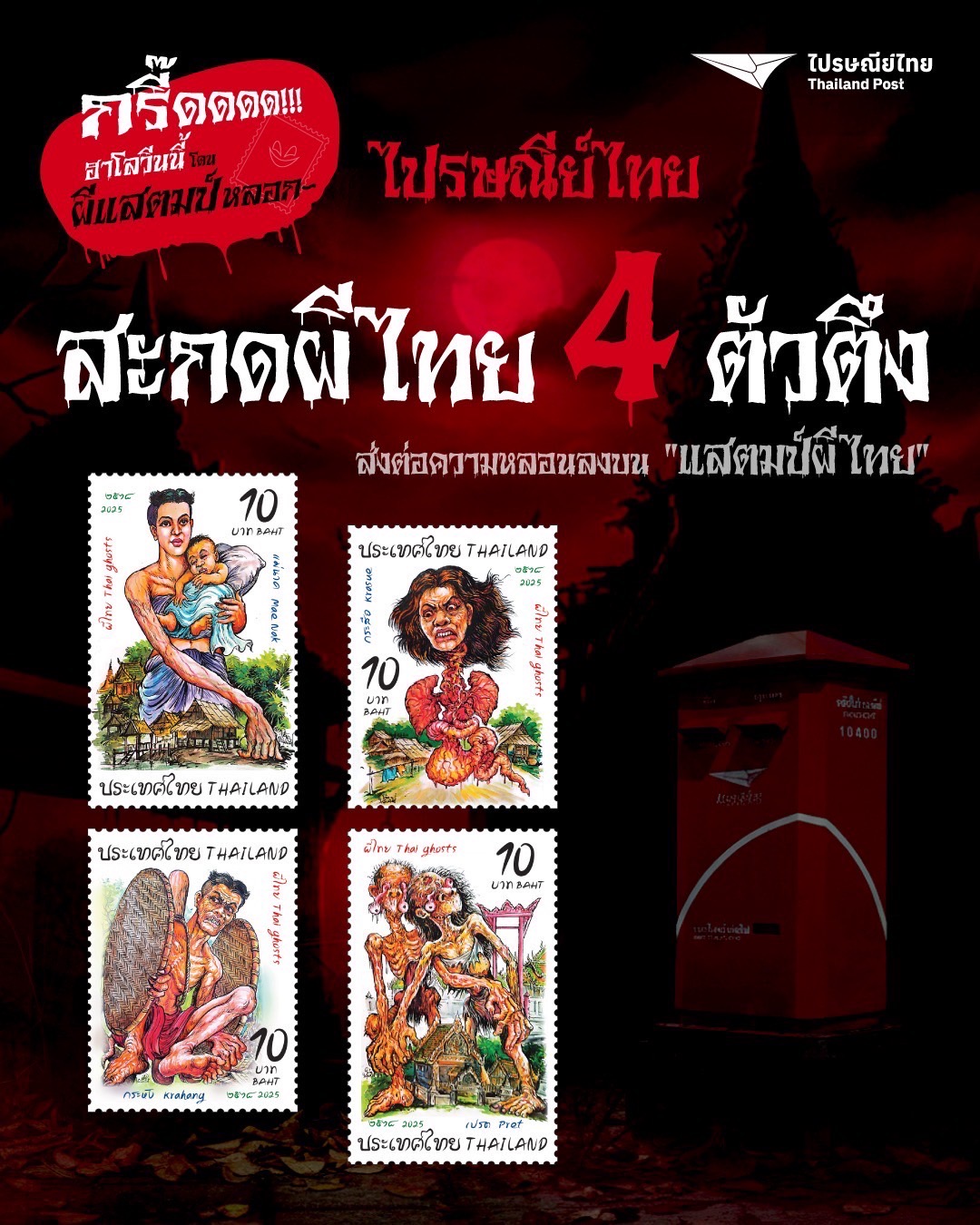 ฮาโลวีนปีนี้ ไม่ต้องบินไกลไปถึงต่างประเทศเพื่อสัมผัสความหลอนต้นตำรับ เพราะไปรษณีย์ไทย ขอชวนคนไทยเปิดประสบการณ์ความหลอนแบบไทยแท้ ผ่านแสตมป์ชุดพิเศษ “ผีไทย Thai Ghosts” ครั้งแรกที่ตำนานผีไทยถูกตีความใหม่ให้ร่วมสมัยในรูปแบบศิลปะบนดวงแสตมป์ ที่ถ่ายทอดเสน่ห์ของความเชื่อพื้นบ้านผ่าน 4 ผีระดับตำนาน ทั้ง แม่นาค – ผีกระสือ – ผีกระหัง – ผีเปรต ที่จะมาสะกดทุกสายตาด้วยงานออกแบบที่ผสานระหว่างความขลังและศิลปะร่วมสมัย พร้อมส่งต่อป็อปคัลเจอร์ความหลอนแบบไทยให้กลายเป็นของสะสมที่ทั้งเท่และมีเรื่องราว