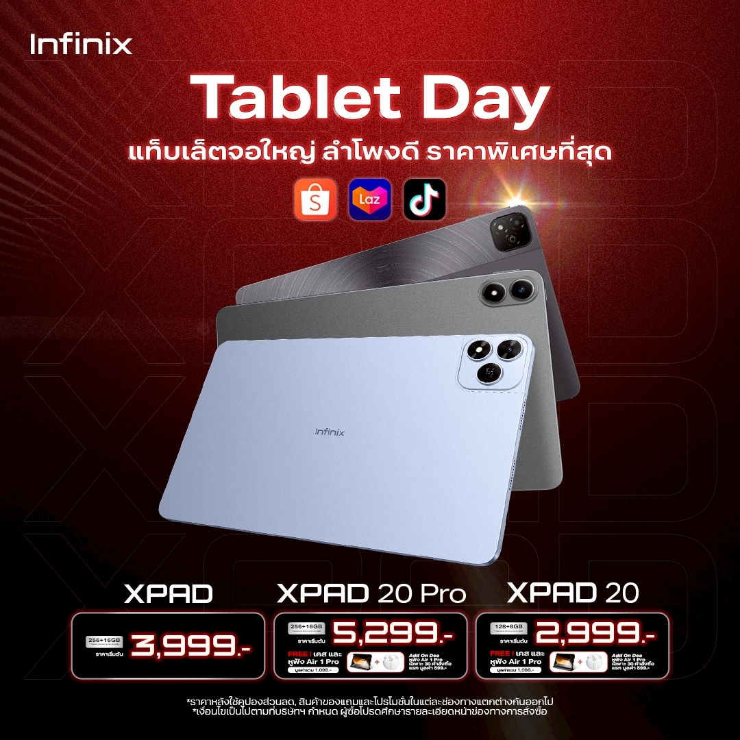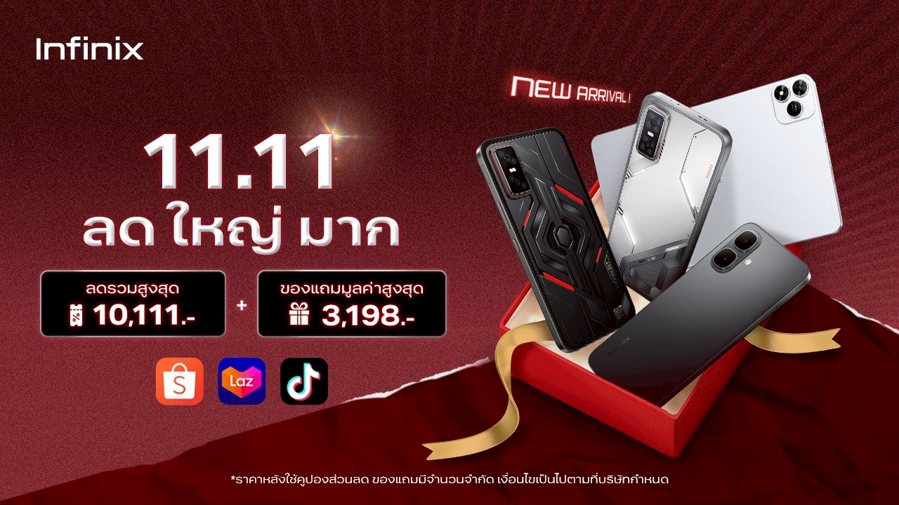 นอกจากความคุ้มค่าจัดเต็มของ Infinix HOT 60i 5G แล้วอินฟินิกซ์ยังขนทัพสมาร์ทโฟนและแกดเจ็ตรุ่นดังมาร่วมโปรแรง 11.11 มอบส่วนลดสูงสุดถึง 10,111 บาท พร้อมของแถมมูลค่ารวมสูงสุด 3,198 บาท และข้อเสนอพิเศษผ่อน 0% สูงสุด 6 เดือน เริ่มจากกลุ่มแท็บเล็ตที่ตอบโจทย์การใช้งานครบจบในเครื่องเดียว XPAD 20 เริ่มต้นราคา 2,999 บาท และ XPAD 20 Pro เริ่มต้นราคา 5,299 บาท พิเศษเมื่อซื้อ XPAD 20 และ XPAD 20 Pro ทุกออเดอร์ รับฟรี เคสกันรอย มูลค่า 499 บาท และ 30 คำสั่งซื้อแรก รับฟรี Air 1 Pro มูลค่า 599บาท ด้านสมาร์ทโฟนเกมมิ่งและระดับเรือธงก็ไม่น้อยหน้ากับ GT 30 Pro ในราคา 10,457 บาทและ GT 30 5G ในราคา 6,999 บาท สำหรับสายทำงานและความบันเทิงต้อง NOTE 50 Pro+ 5G ในราคา 11,370 บาท ส่วนซีรีส์ HOT ที่เน้นความคุ้มค่าคุ้มราคามาพร้อมรุ่นใหม่ล่าสุด HOT 60i 5G ในราคา 4,315 บาทและปิดท้ายด้วยสมาร์ทโฟนสุดคุ้มสำหรับผู้เริ่มต้น อย่าง SMART 10 64 GB เริ่มต้นราคา 1,899 บาท เท่านั้น