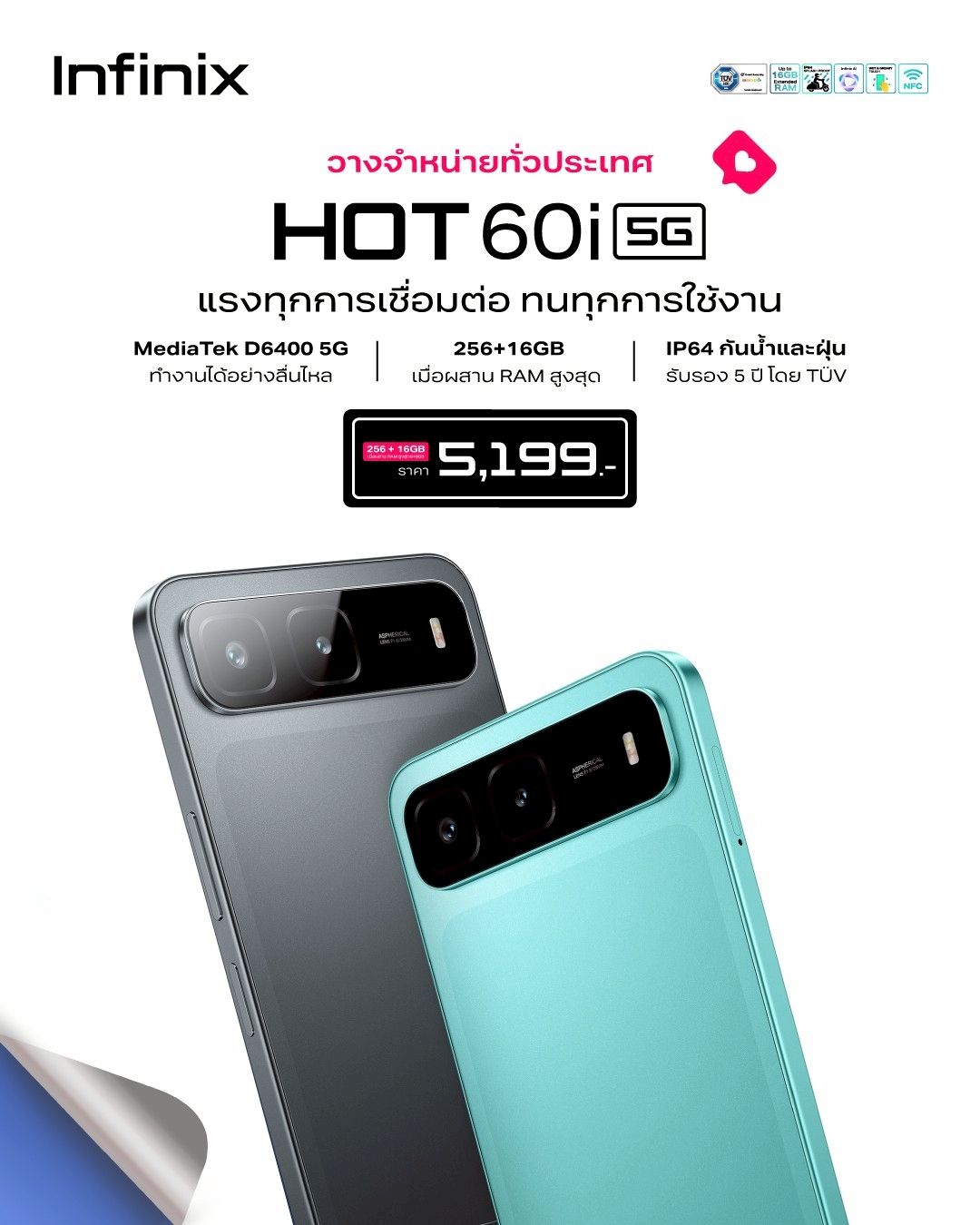 อีกหนึ่งจุดเด่นของ HOT 60i 5G คือความทนทานด้วยมาตรฐาน IP64 กันน้ำและกันฝุ่น ช่วยปกป้องตัวเครื่องจากการใช้งานในชีวิตประจำวันได้อย่างมั่นใจ ตัวเครื่องมาในดีไซน์ที่เรียบหรูและหน้าจอแสดงผล ขนาด 6.75 นิ้ว ความชัด HD+ 120Hz มอบภาพที่คมชัด สวยงาม รับชมวิดีโอหรือคอนเทนต์โซเชียลได้เต็มตา กล้องหลังความละเอียดสูง 50MP และกล้องหน้า 5MP มอบภาพถ่ายคมชัดทุกสภาพแสง ปลดล็อกประสบการณ์สมาร์ทโฟนที่ชาญฉลาดยิ่งขึ้นด้วย Infinix AI เพื่อให้ผู้ใช้ได้สัมผัสกับเทคโนโลยี AI ล้ำสมัยตลอดเวลา ด้วยฟีเจอร์ Ask Everything เพียงสัมผัสเดียวก็พร้อมตอบทุกคำถาม และยังสามารถสนุกกับการสร้างสรรค์ภาพถ่ายที่สมบูรณ์แบบด้วยฟีเจอร์ AI Eraser และ AI Extender และการเปลี่ยนภาพสเก็ตช์หรือคำพูดให้กลายเป็นงานศิลป์ได้อย่างง่ายดาย ให้ทุกชิ้นงานไม่ซ้ำใคร รวมถึงความสามารถใหม่ อย่าง Circle to Search ที่จะทำให้การค้นหาข้อมูลจากภาพเป็นเรื่องง่ายเพียงแค่การวงกลมในภาพหรือข้อมูลที่ต้องการ พร้อมระบบโอนข้อมูลด้วย NFC เพียงสัมผัสก็สามารถแชร์ไฟล์ระหว่างสมาร์ทโฟนอินฟินิกซ์กับอุปกรณ์ใกล้เคียงได้ทันทีด้วยความเร็วแรง เพื่อการสื่อสารที่ทรงพลังและง่ายดาย HOT 60i 5G จึงเป็นตัวเลือกที่ชาญฉลาดสำหรับผู้ที่มองหาสมาร์ทโฟนที่ตอบโจทย์ทั้งราคา ประสิทธิภาพ และความทนทาน โดยมี 2 สีสันให้เลือกได้แก่ Sleek Black (ดำ) และ Monsoon Green (เขียว) ในราคาสุดคุ้มเพียง 5,199 บาท เท่านั้น
