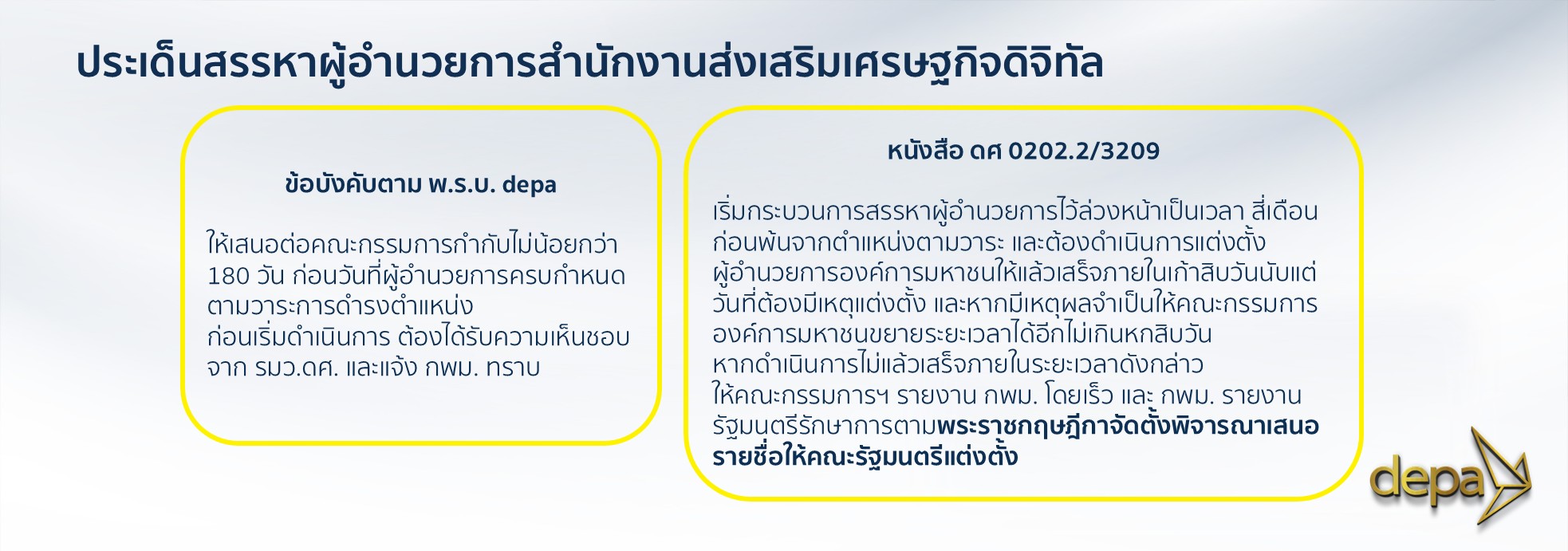 นอกจากประเด็นเรื่องไทม์ไลน์แล้ว ผู้อำนวยการใหญ่ ดีป้า ยังได้อธิบายถึงข้อกำหนดทางกฎหมายเฉพาะขององค์กรที่ระบุไว้ชัดเจนว่า หากผู้อำนวยการพ้นจากตำแหน่ง (ตามวาระหรือก่อนวาระ) รองผู้อำนวยการทั้ง 4 คน จะต้องพ้นจากตำแหน่งไปพร้อมกันด้วย กฎหมายนี้ถูกออกแบบมาเพื่อให้ทีมผู้บริหาร “อยู่เรือลำเดียวกัน” และลดปัญหาความขัดแย้งในการบริหาร