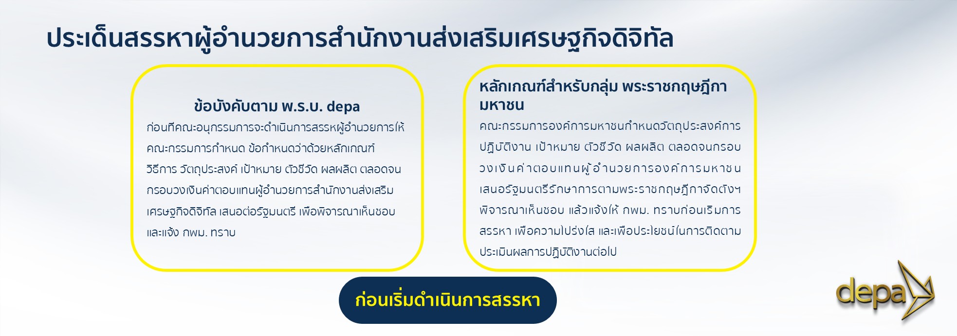 “ทุกขั้นตอนของกระบวนการสรรหาดำเนินการตามกฎหมาย ข้อบังคับ และหลักธรรมาภิบาลอย่างเคร่งครัด สามารถตรวจสอบได้ในทุกขั้นตอน” ผู้อำนวยการใหญ่ ดีป้า กล่าวย้ำ พร้อมทั้งเน้นย้ำถึงความสำคัญของการให้โอกาสผู้ที่มีศักยภาพได้เข้ามาแสดงวิสัยทัศน์ เพื่อคัดเลือกผู้บริหารที่เหมาะสมที่สุดในการขับเคลื่อนประเทศชาติต่อไป