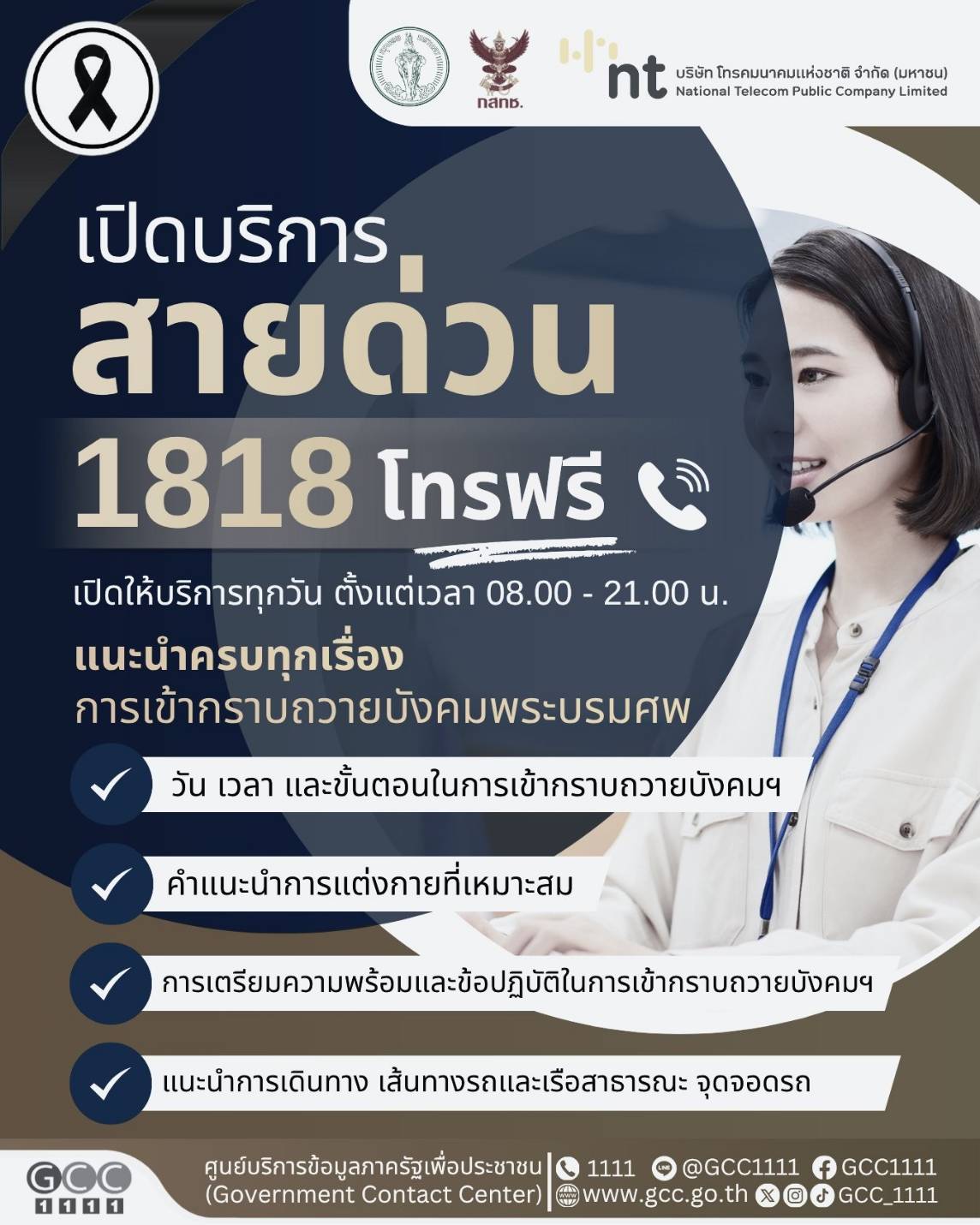 บริการสายด่วนโทรฟรี 1818 เป็นเลขหมายกลางที่จัดตั้งขึ้นเพื่อให้ประชาชนสามารถสอบถามข้อมูลได้อย่างครบถ้วนและถูกต้อง โดยมีเจ้าหน้าที่ให้บริการทุกวันตั้งแต่เวลา 08.00 – 21.00 น. ซึ่งประชาชนสามารถใช้บริการเพื่อรับทราบข้อมูลที่ถูกต้องในการเข้ากราบถวายบังคม พระบรมศพ โดยไม่มีค่าใช้จ่าย อาทิ