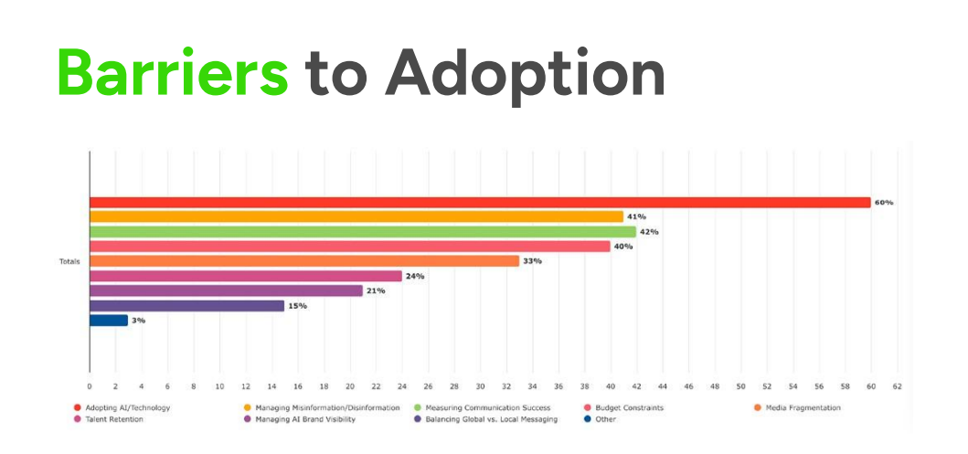 3. ความท้าทายสำคัญที่ต้องเผชิญ: มองบวกแต่ยังไม่มั่นใจ ต้องการ Framework การใช้ AI ที่ชัดเจน แม้จะเปิดกว้างรับ AI แต่เมื่อถามถึงความท้าทายที่น่ากังวลที่สุดที่คาดว่าจะต้องเผชิญในอีก 2 ปีข้างหน้า นักประชาสัมพันธ์ส่วนใหญ่กว่า 60% มีความเห็นตรงกันว่า การนำ AI และเทคโนโลยีใหม่มาใช้ท้าทายมากที่สุด รองลงมา 42% คือการวัดผลความสำเร็จของการสื่อสาร ในบริบทใหม่ที่ข้อมูลถูกประมวลผลผ่านระบบ AI มากขึ้น และอีก 41% มองว่าการรับมือกับข้อมูลเท็จและข่าวปลอม ยังเป็นปัญหาเร่งด่วนที่ต้องจัดการ ซึ่งสะท้อนว่า แม้นักประชาสัมพันธ์ส่วนใหญ่จะมีทัศนคติที่ดีต่อ AI แต่การใช้งานอย่างมีประสิทธิภาพยังต้องพึ่งพา “กรอบการทำงานที่ชัดเจน” ทั้งในด้านเครื่องมือ นโยบายและมาตรฐานจริยธรรม