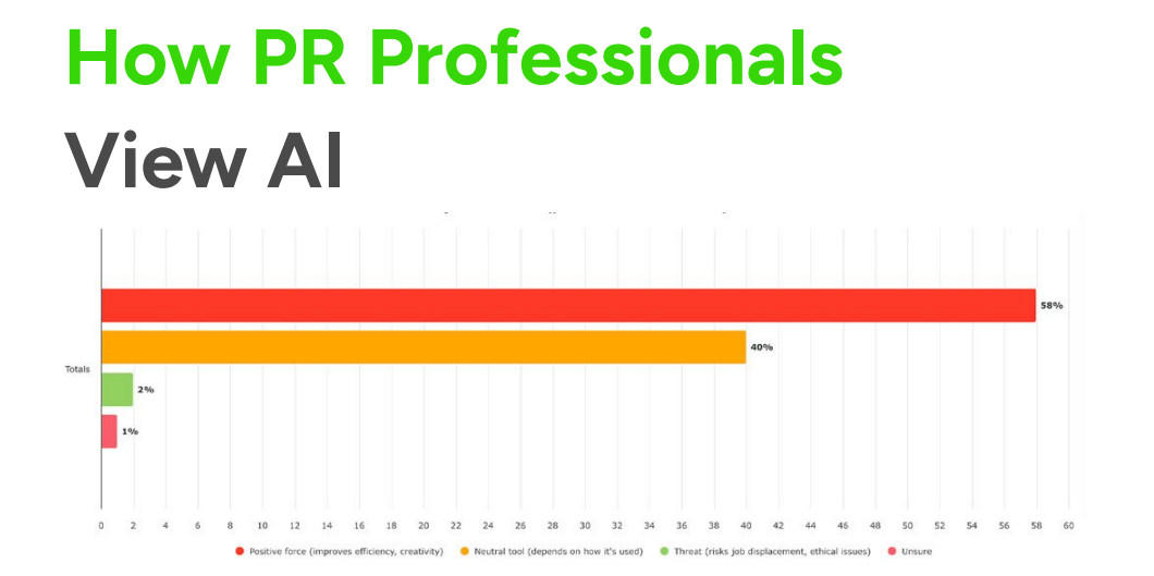 1. มุมมองของนักประชาสัมพันธ์ต่อ AI: PR เอเชีย มองบวก AI เป็น “เพื่อนร่วมงาน” ไม่ใช่ “คู่แข่ง” ผลสำรวจพบว่า ภาพรวมของนักประชาสัมพันธ์ในเอเชียมีทัศนคติที่เป็นบวกต่อ AI อย่างชัดเจน โดย 58% มองว่า AI จะช่วยเพิ่มทั้งประสิทธิภาพ ความคิดสร้างสรรค์ และความสามารถในการวิเคราะห์ซึ่งแตกต่างจากหลายรายงานในตะวันตกที่มักกังวลว่า AI จะเข้ามาแย่งงาน แต่ PR ในเอเชียส่วนใหญ่มอง AI เป็น “เครื่องมือเสริม” มากกว่าเป็นภัยคุกคาม สะท้อนถึงทัศนคติที่เปิดกว้างและพร้อมปรับตัว