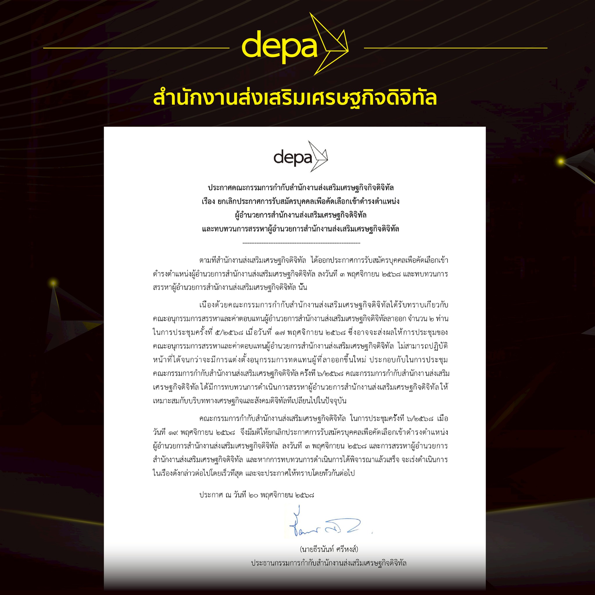ดีป้า ยกเลิกประกาศการรับสมัครบุคคลเพื่อคัดเลือกเข้าดำรงตำแหน่งผู้อำนวยการสำนักงานฯ และทบทวนการดำเนินการสรรหาการประชุมคณะกรรมการกำกับสำนักงานส่งเสริมเศรษฐกิจดิจิทัล ครั้งที่ 6/2568 วานนี้ (19 พ.ย. 2568)