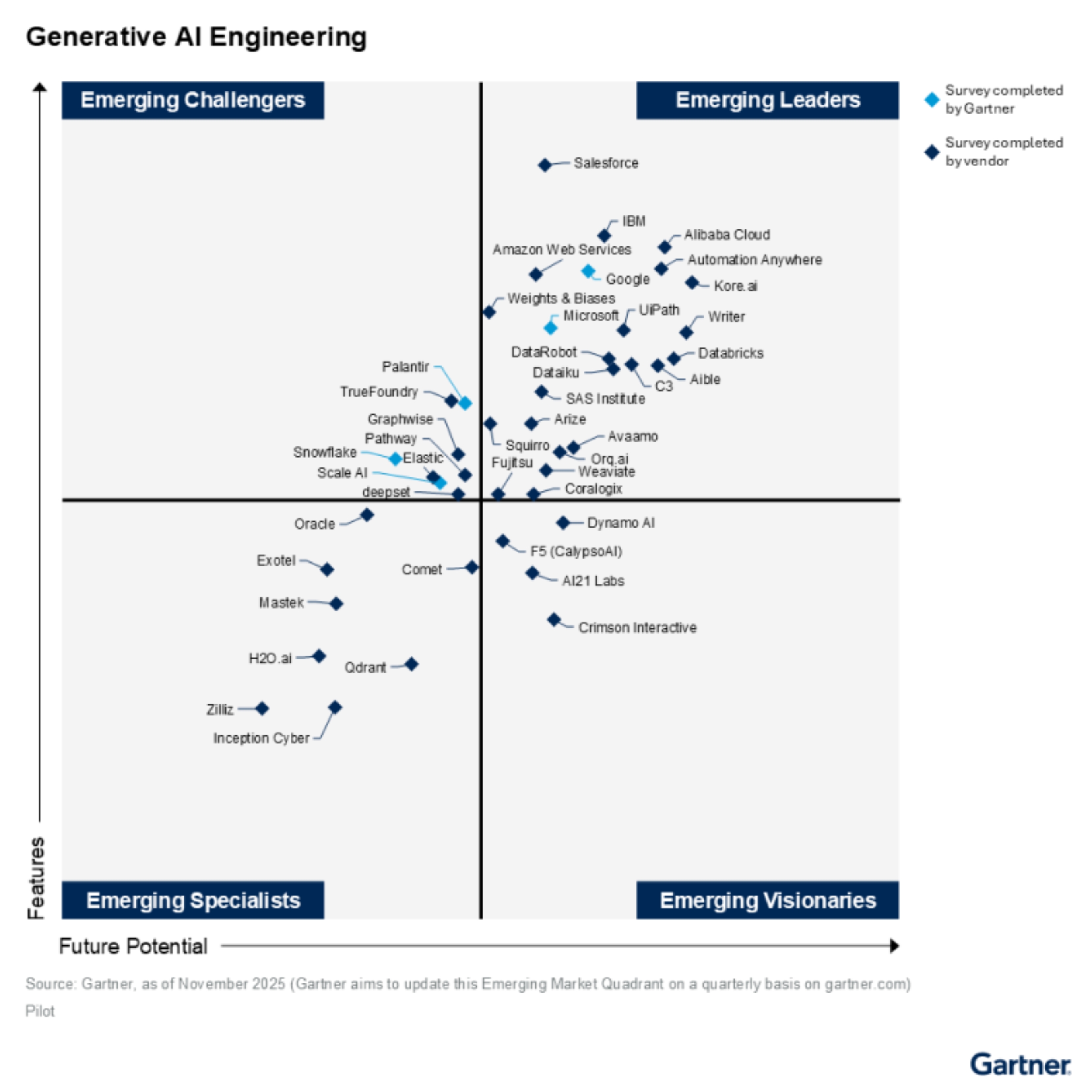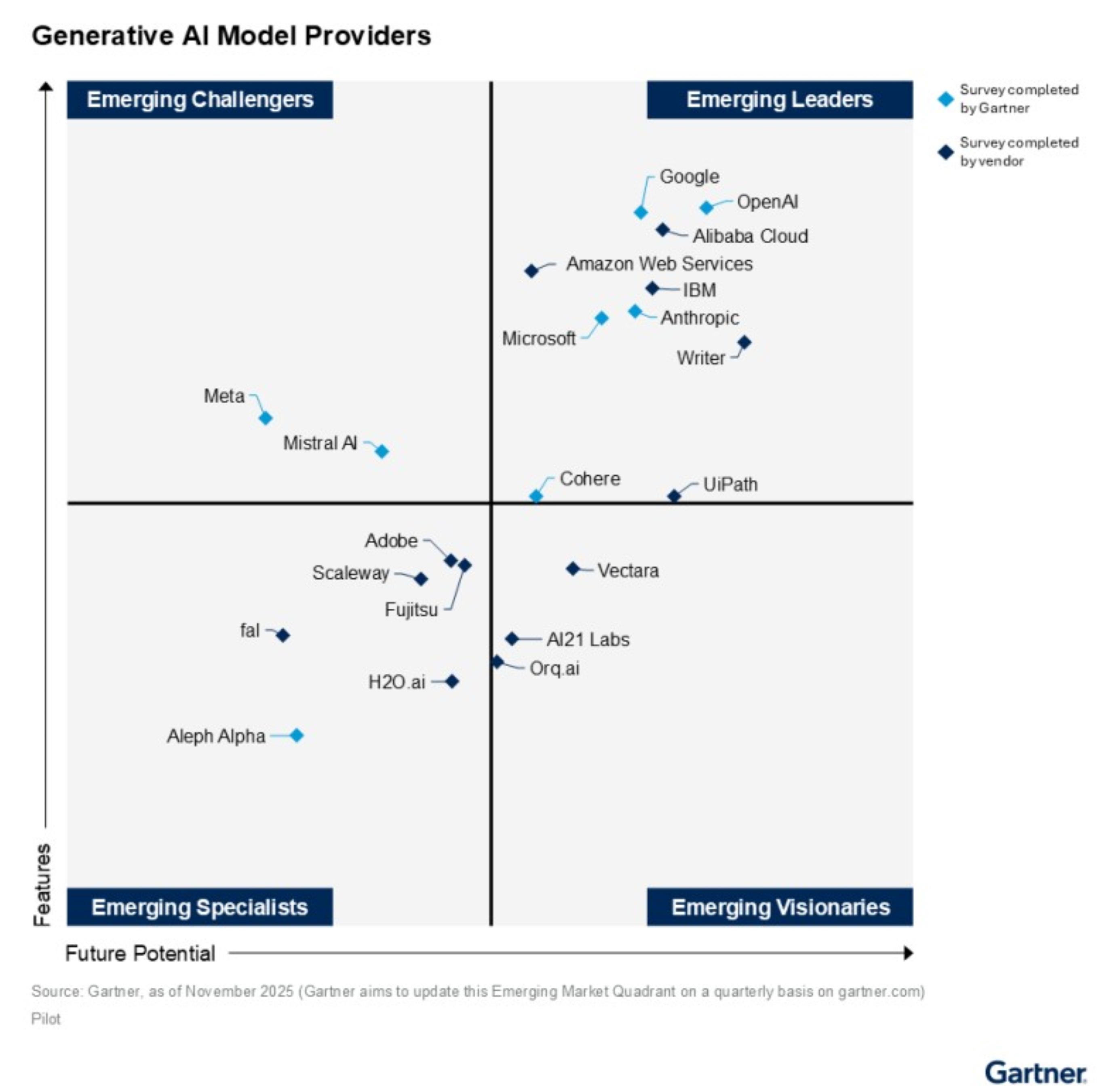 Gartner ระบุว่า Emerging Market Quadrant คือ “การจัดวางตำแหน่งผู้ให้บริการด้าน generative AI” ใน “ตลาดที่มีพลวัตและเคลื่อนไหวอย่างรวดเร็ว” และโดยทั่วไป “Emerging Leader มักเป็นผู้ให้บริการที่เป็นที่รู้จักในตลาดที่มาพร้อมคุณสมบัติต่าง ๆ ที่แข็งแกร่งและมีศักยภาพในอนาคต”