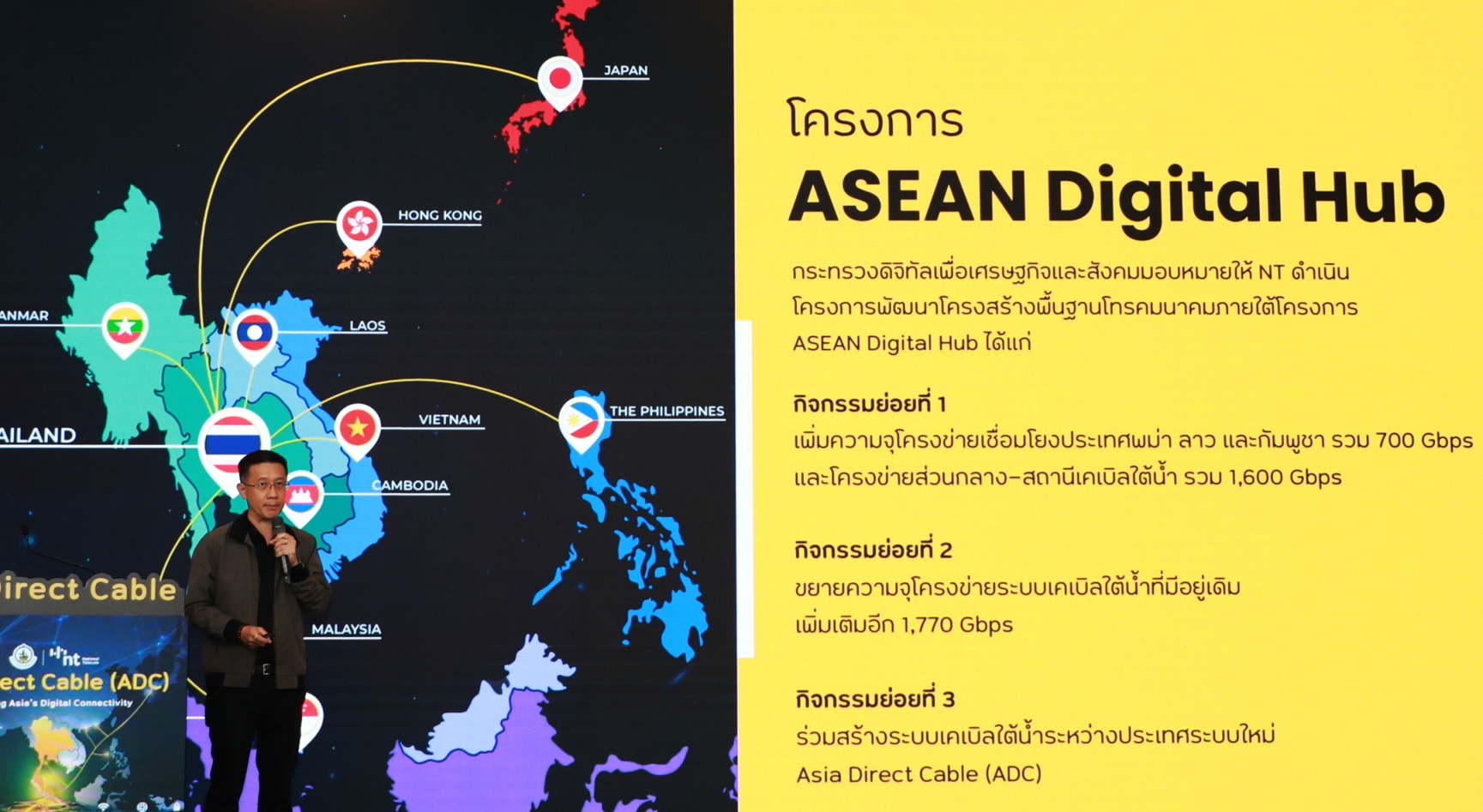 บริษัท โทรคมนาคมแห่งชาติ จำกัด (มหาชน) หรือ NT ประกาศเปิดใช้งานโครงข่ายเคเบิลใต้น้ำระหว่างประเทศ Asia Direct Cable (ADC) อย่างเป็นทางการ โดยมีระยะทางรวมกว่า 9,988 กิโลเมตร เชื่อมต่อประเทศสำคัญในเอเชีย ได้แก่ จีน (เขตบริหารพิเศษฮ่องกงและมณฑลกวางตุ้ง), ญี่ปุ่น, ฟิลิปปินส์, สิงคโปร์, ไทย และเวียดนาม ซึ่งจะมีบทบาทสำคัญในการเพิ่มขีดความสามารถด้านโครงสร้างพื้นฐานโทรคมนาคมของภูมิภาค และสนับสนุนการเติบโตของเศรษฐกิจดิจิทัลอย่างยั่งยืน โดยพิธีเปิดโครงข่ายเคเบิลใต้น้ำระบบ ADC ในครั้งนี้ จัดขึ้น ณ จังหวัดชลบุรี