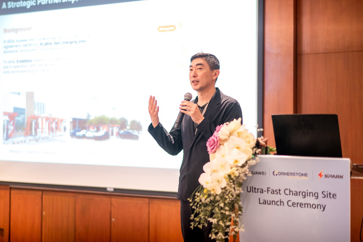โซอี้ เกา กรรมการผู้จัดการ กลุ่มธุรกิจพลังงานดิจิทัล (Digital Power) บริษัท หัวเว่ย อินเตอร์เนชันแนล จำกัด เปิดเผยว่า ท่ามกลางการเติบโตอย่างรวดเร็วของตลาดยานยนต์ไฟฟ้าในภูมิภาคเอเชียตะวันออกเฉียงใต้ ไปจนถึงเทคโนโลยีการเดินทางอัจฉริยะและพลังงานสีเขียวในประเทศอย่างเป็นรูปธรรม จึงทำให้เกิดการร่วมมือกันระหว่าง หัวเว่ย คอร์เนอร์สโตน เทคโนโลยีและ สปาร์ค อีวี เปิดตัวโครงการนำร่องสถานีชาร์จความเร็วสูงพิเศษ (Ultra-fast Charging Stations) จำนวน 10 แห่ง ได้เปิดให้บริการอย่างเป็นทางการแล้ว 8 แห่ง เปิดตัวครอบคลุม 3 เมืองสำคัญด้านเศรษฐกิจและการท่องเที่ยวของไทย ได้แก่ กรุงเทพมหานคร พัทยา และเชียงใหม่ โครงการนี้เกิดขึ้นเพื่อช่วยแก้ปัญหาการขาดแคลนสถานีชาร์จยานยนต์ไฟฟ้า และมีแผนจะสร้างเครือข่ายการชาร์จที่ครอบคลุมพื้นที่ทั่วประเทศ รองรับผู้ใช้ยานยนต์ไฟฟ้าด้วยการเดินทางระยะไกลอย่างไร้รอยต่อ โดยนำเทคโนโลยีการเดินทางอัจฉริยะด้านพลังงานสีเขียวของหัวเว่ยมาประยุกต์ใช้เพื่อยกระดับเครือข่ายสถานีชาร์จรถยนต์ไฟฟ้าในภูมิภาคเอเชียตะวันออกเฉียงใต้