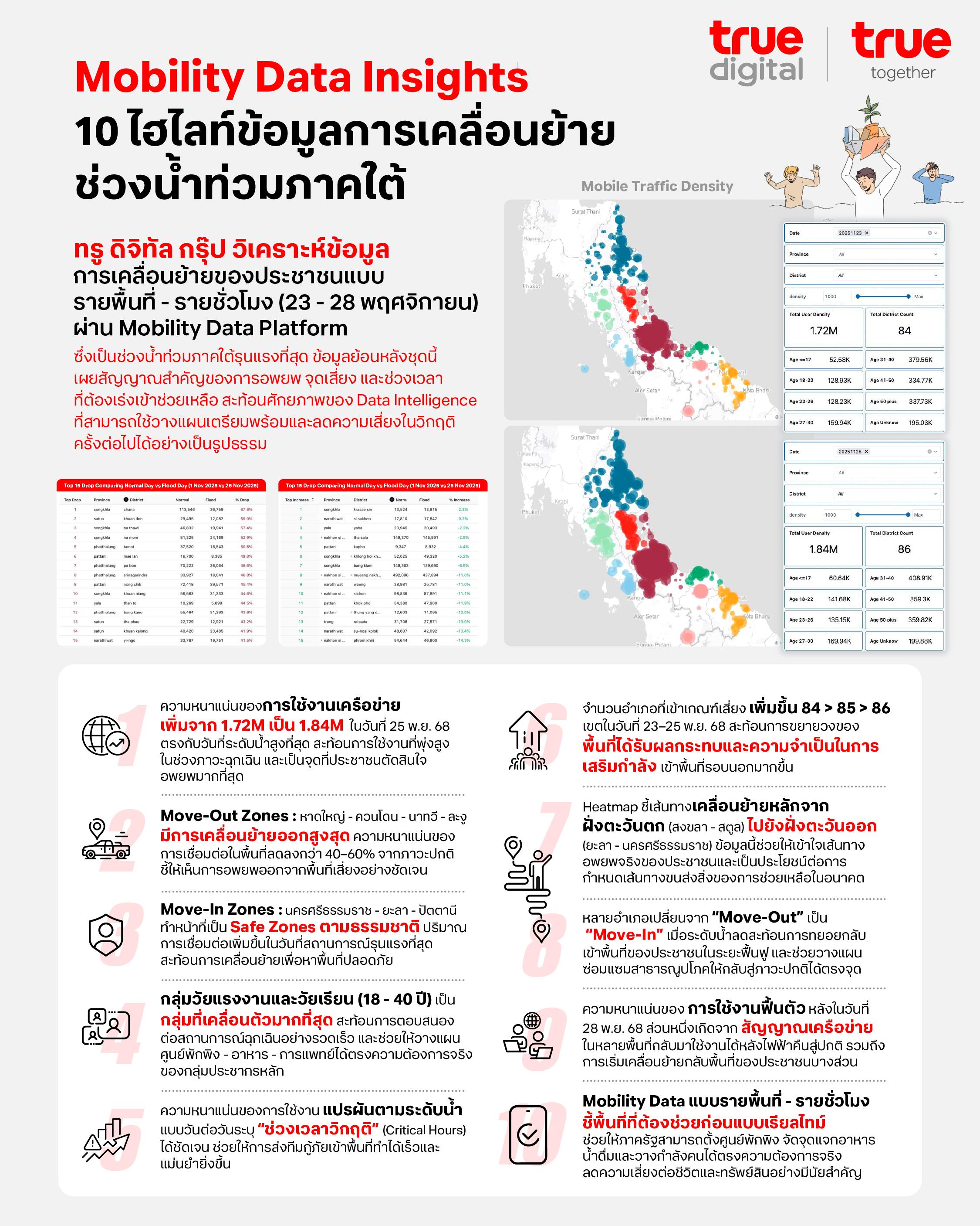 ทรู ดิจิทัล กรุ๊ป วิเคราะห์ข้อมูลการเคลื่อนย้ายของประชากรบนเครือข่ายทรู 5G ผ่าน Mobility Data Platform ตั้งแต่วันที่ 20 พฤศจิกายน 2568 และพบรูปแบบ “การอพยพผิดปกติ” ในหลายพื้นที่ เป็นสัญญาณเตือนระดับน้ำกำลังทวีความรุนแรง อาทิ การตรวจพบจำนวนประชากรในพื้นที่อำเภอจะนะ จังหวัดสงขลา ที่ลดลงสูงสุดถึง 68% รองลงมาคือ อำเภอควนโดน จังหวัดสตูล และอำเภอนาทวี จังหวัดสงขลา ขณะที่อำเภอหาดใหญ่มีการเคลื่อนย้ายออกจากพื้นที่มากที่สุด ข้อมูลดังกล่าวเหล่านี้แสดงให้เห็นผลกระทบในวงกว้างและความจำเป็นในการระดมทีมสนับสนุนเพิ่มเติมอย่างเร่งด่วน