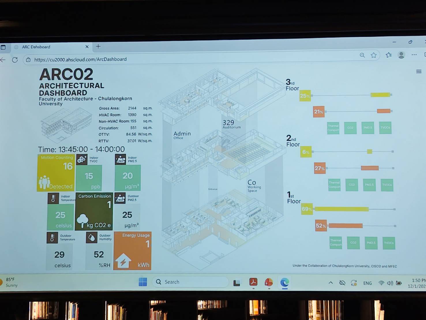 นอกจากนี้ MFEC ยังช่วยออกแบบและจัดทำ Dashboard ซึ่งถือเป็น Dashboard แรกในประเทศไทยที่แสดงผลด้านคุณภาพอากาศ, คาร์บอนฟุตพริ้นท์, พลังงาน, และการใช้งานพื้นที่ที่สอดคล้องกับความเป็นจริงแบบ Real-time Dashboard นี้ถูกออกแบบมาเฉพาะสำหรับสองกลุ่มผู้ใช้งาน คือ ทีมวิศวกรที่ต้องการข้อมูลเชิงเทคนิค และผู้บริหารคณะที่ต้องการข้อมูลเชิงลึกเพื่อนำไปตัดสินใจและปฏิบัติ แพลตฟอร์มนี้ไม่ได้แสดงแค่ตัวเลข แต่ยังมองถึงพฤติกรรมที่มีผลต่อตัวเลขนั้นๆ และเสนอการแก้ไขปัญหาด้วย