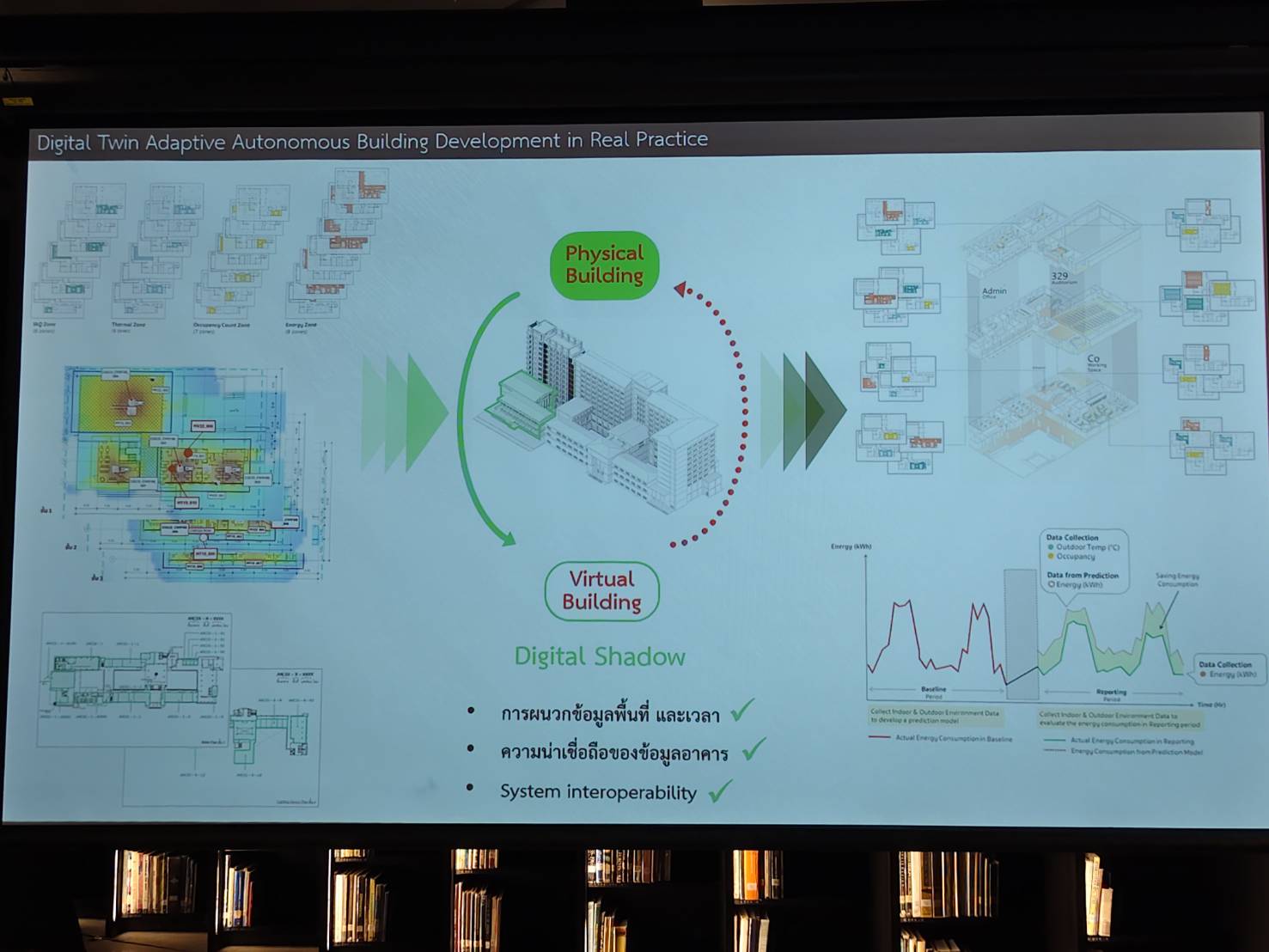 Digital Twin แบบเรียลไทม์ที่คณะสถาปัตยกรรมศาสตร์ จุฬาลงกรณ์มหาวิทยาลัย ทำหน้าที่รวบรวมข้อมูลจากเซ็นเซอร์และระบบอาคารต่างๆ เพื่อสร้างข้อมูลเชิงลึกที่ช่วยให้การใช้พลังงาน และพื้นที่มีประสิทธิภาพสูงสุด โครงการนี้ใช้เทคโนโลยี Digital Twin ในการรวบรวมข้อมูลจากระบบ IT และ OT, เซ็นเซอร์ IoT และข้อมูลอาคาร เพื่อวิเคราะห์และนำเสนอข้อมูลเชิงลึกแบบเรียลไทม์ ซึ่งช่วยให้สามารถบริหารจัดการการใช้พลังงาน พื้นที่ และคุณภาพสภาพแวดล้อมได้อย่างมีประสิทธิภาพสูงสุด