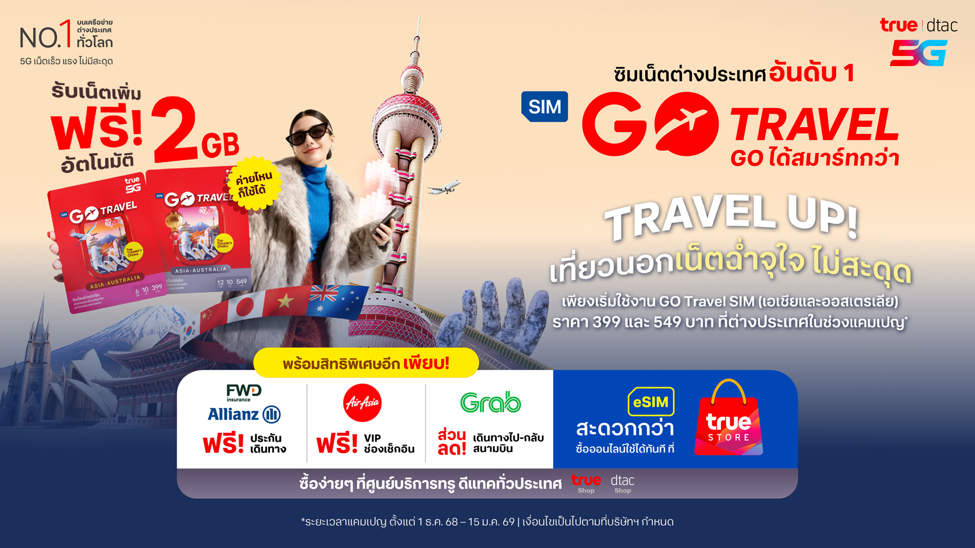 รับสิทธิ์ง่ายๆ เพียงซื้อแพ็กเกจเน็ตต่างประเทศ GO Travel หรือเริ่มใช้งานซิมเน็ตต่างประเทศ GO Travel SIM สำหรับใช้งานในโซนทวีปเอเชีย และออสเตรเลีย อาทิประเทศ จีน ญี่ปุ่น มาเก๊า ไต้หวัน ฮ่องกง เกาหลีใต้ เวียดนาม ตุรกี(ทูร์เคีย) ซาอุดีอาระเบีย ออสเตรเลีย และประเทศอื่นๆ รวมกว่า 36 ประเทศ ในช่วงแคมเปญ รับทันที! เน็ตโรมมิ่งเพิ่ม 2GB ให้อัตโนมัติ ช่วยให้เดินทางได้สนุกกว่า คุ้มกว่า และมั่นใจกว่าที่เคย ตั้งแต่วันที่ 1 ธ.ค. 2568 – 15 ม.ค. 2569 นี้เท่านั้น