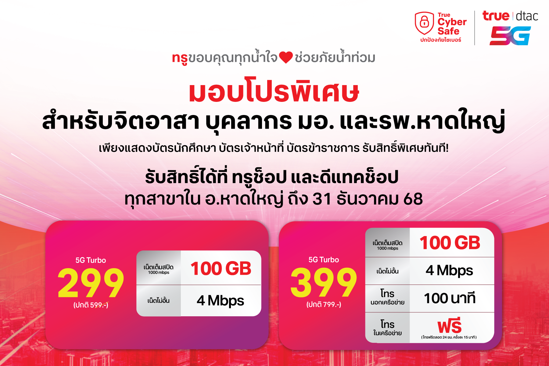 หลังสถานการณ์น้ำท่วมใหญ่ที่ส่งผลกระทบต่อชุมชนในอำเภอหาดใหญ่และจังหวัดสงขลาอย่างหนัก ทรู ดีแทค ขอเป็นอีกหนึ่งพลังเล็กๆ ร่วมส่งต่อกำลังใจ ภายใต้แนวคิด “น้ำท่วมจากไป น้ำใจคงอยู่” พร้อมช่วยแบ่งเบาภาระด้านการสื่อสาร ซึ่งเป็นสิ่งจำเป็นในช่วงเวลายากลำบาก ด้วยข้อเสนอพิเศษทั้งสมาร์ทโฟนและแพ็กเกจรายเดือนในราคาประหยัด เพื่อช่วยลดภาระค่าใช้จ่ายและทำให้ทุกคนยังคงออนไลน์ได้อย่างต่อเนื่อง