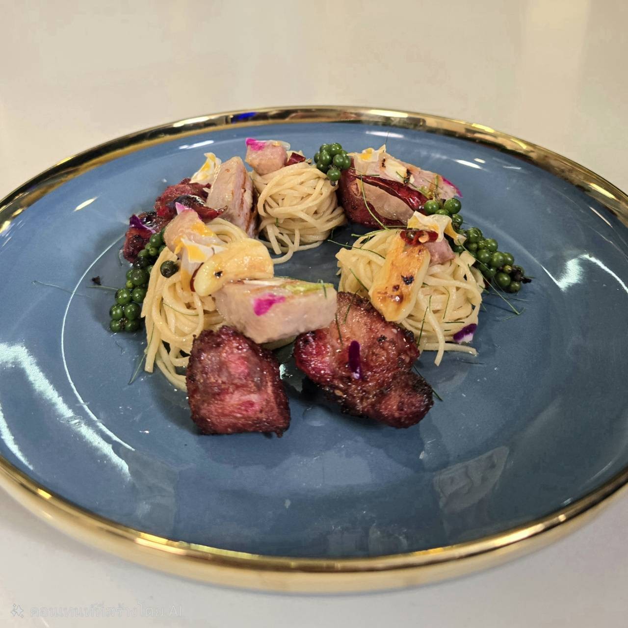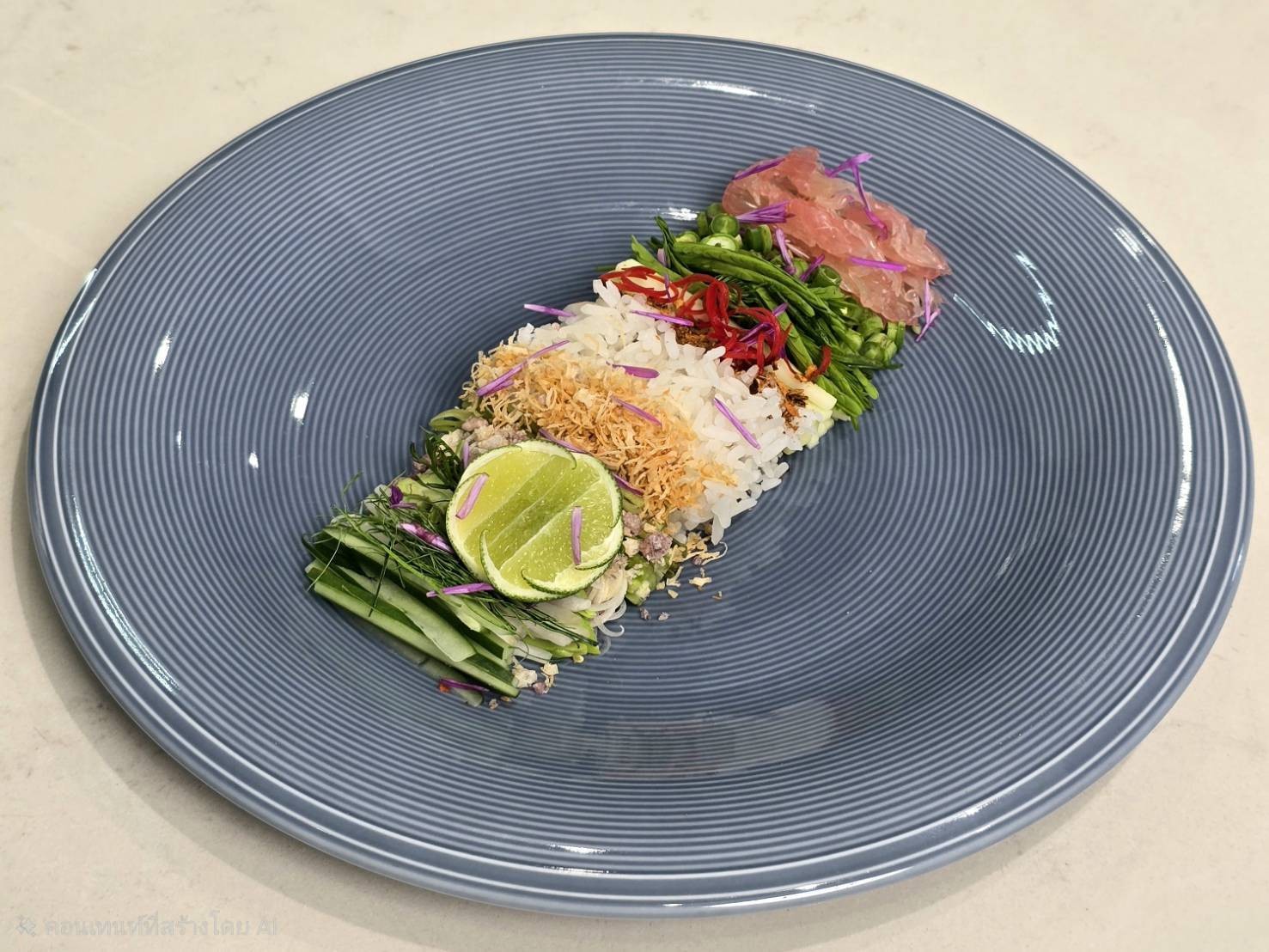 · “ข้าวยำปักษ์ใต้สมุนไพร” เมนูนี้คัดเลือกวัตถุดิบคุณภาพจากหลายภูมิภาค เริ่มตั้งแต่ ข้าวหอมมะลิตราไปรฯ ตัวท็อปจากสุรินทร์ ที่หอมกรุ่น ส้มโอทับทิมสยาม ตัวท็อปจังหวัดนครศรีธรรมราช กุ้งเสียบสมุนไพร ตัวท็อปจังหวัดกระบี่ และสะตอข้าว ตัวท็อปจังหวัดตรัง ที่ให้ความกรอบและรสขมเล็กๆ ตัดกับความหวานของ ข้าวแต๋น ตัวท็อปจังหวัดสุพรรณบุรี ที่นำมาปรับเป็นส่วนผสมให้เพิ่มเทกซ์เจอร์สนุกในแต่ละคำ การปรุงข้าวยำเริ่มด้วยการซอยสมุนไพรสด ๆ อย่างใบมะกรูด ตะไคร้ และผักชี จากนั้นคลุกเคล้ากับข้าวหอมมะลิ กุ้งเสียบ และข้าวแต๋น เติมน้ำบูดูที่ปรุงรสแบบเปรี้ยว-หวาน-เค็มให้ครบเครื่อง ก่อนโรยส้มโอและสะตอเพื่อเพิ่มความหอมและความสดชื่น ทำให้ทุกคำเต็มไปด้วยรสชาติสมุนไพรแท้ต้นตำรับ