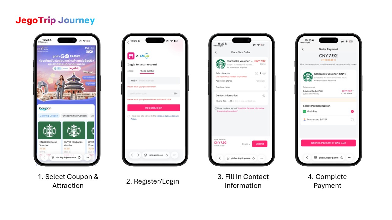 เมื่อทำรายการสำเร็จ ลูกค้าจะได้รับ SMS พร้อมลิงก์สำหรับเข้าสู่ JegoTrip เพื่อเลือกรับสิทธิพิเศษและส่วนลดจาก JegoTrip ที่ใช้ได้ในประเทศจีน