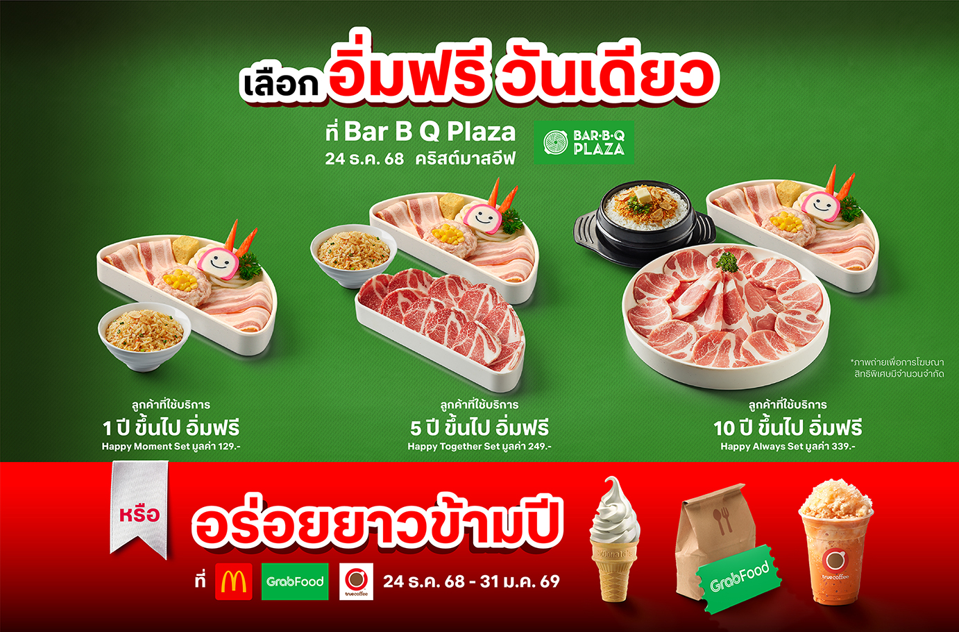 · ใช้สิทธิ์ เริ่มใช้สิทธิ์ อิ่มฟรีวันเดียว ที่บาร์บีคิว พลาซ่าพร้อมกันในวันที่ 24 ธ.ค. 68 หรือ อร่อยยาวข้ามปี ที่ทรูคอฟฟี่ GrabFood หรือ McDonald’s ได้ตั้งแต่วันที่ 24 ธ.ค. 68 – 31 ม.ค. 69