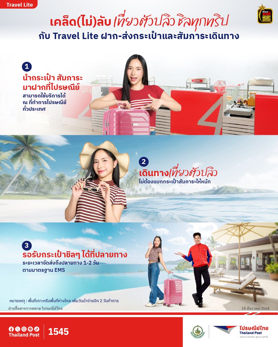 บริษัท ไปรษณีย์ไทย จำกัด เดินหน้าตอกย้ำบทบาทผู้ช่วยเดินทางยุคใหม่ หนุนบริการ ‘ทราเวลไลท์’ (Travel Lite) รองรับฤดูกาลท่องเที่ยวที่มีความคึกคักสูงสุดของปี พร้อมเผย “Top 5 จุดรับฝากยอดนิยม” ได้แก่ ภูเก็ต ท่าอากาศยานสุวรรณภูมิ อุดรธานี ย่าน หลักสี่–ดอนเมือง และกลุ่มจังหวัดท่องเที่ยวเชิงธรรมชาติ เช่น กาญจนบุรี เชียงราย และปาย สะท้อนเมืองท่องเที่ยวและเส้นทางเดินทางที่มีจำนวนผู้ใช้บริการเพิ่มขึ้นต่อเนื่อง ชี้เทรนด์การท่องเที่ยวแบบตัวเบาที่มาแรงในหมู่นักเดินทางทั้งชาวไทยและต่างชาติ ขณะที่บริการ Travel Lite และ Travel Lite World ช่วยให้ผู้เดินทางสามารถท่องเที่ยวได้อย่างคล่องตัว มีความปลอดภัย และประหยัดเวลา โดยไม่ต้องแบกสัมภาระหนักระหว่างเช็คอิน-เช็คเอาท์หรือการเดินทางเปลี่ยนเมือง รองรับนักท่องเที่ยวได้ทุกสไตล์ ตั้งแต่การท่องเที่ยวในเมืองใหญ่จนถึงการเดินทางสู่พื้นที่ท่องเที่ยวธรรมชาติ ส่งผลต่อการเพิ่มประสบการณ์ท่องเที่ยวในช่วงไฮซีซันปี 2568 นี้