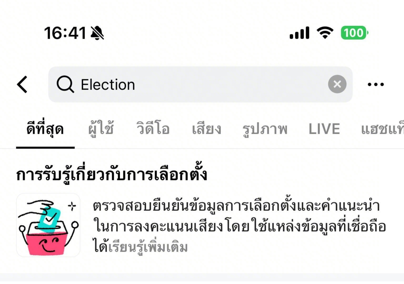 TikTok แพลตฟอร์มการค้นพบระดับโลก ประกาศเปิด "ศูนย์ข้อมูลการเลือกตั้งไทย 2569" ภายในแอปพลิเคชัน TikTok ร่วมมือกับสำนักงานคณะกรรมการการเลือกตั้ง (กกต.) COFACT และ Thai PBS Verify เพื่อให้ชุมชนต่างๆ ของ TikTok ในประเทศไทยเข้าถึงข้อมูลที่เชื่อถือได้และผ่านการตรวจสอบแล้ว พร้อมตัดสินใจอย่างรอบรู้ก่อนลงคะแนนเลือกตั้งทั่วไป ในวันที่ 8 กุมภาพันธ์ 2569