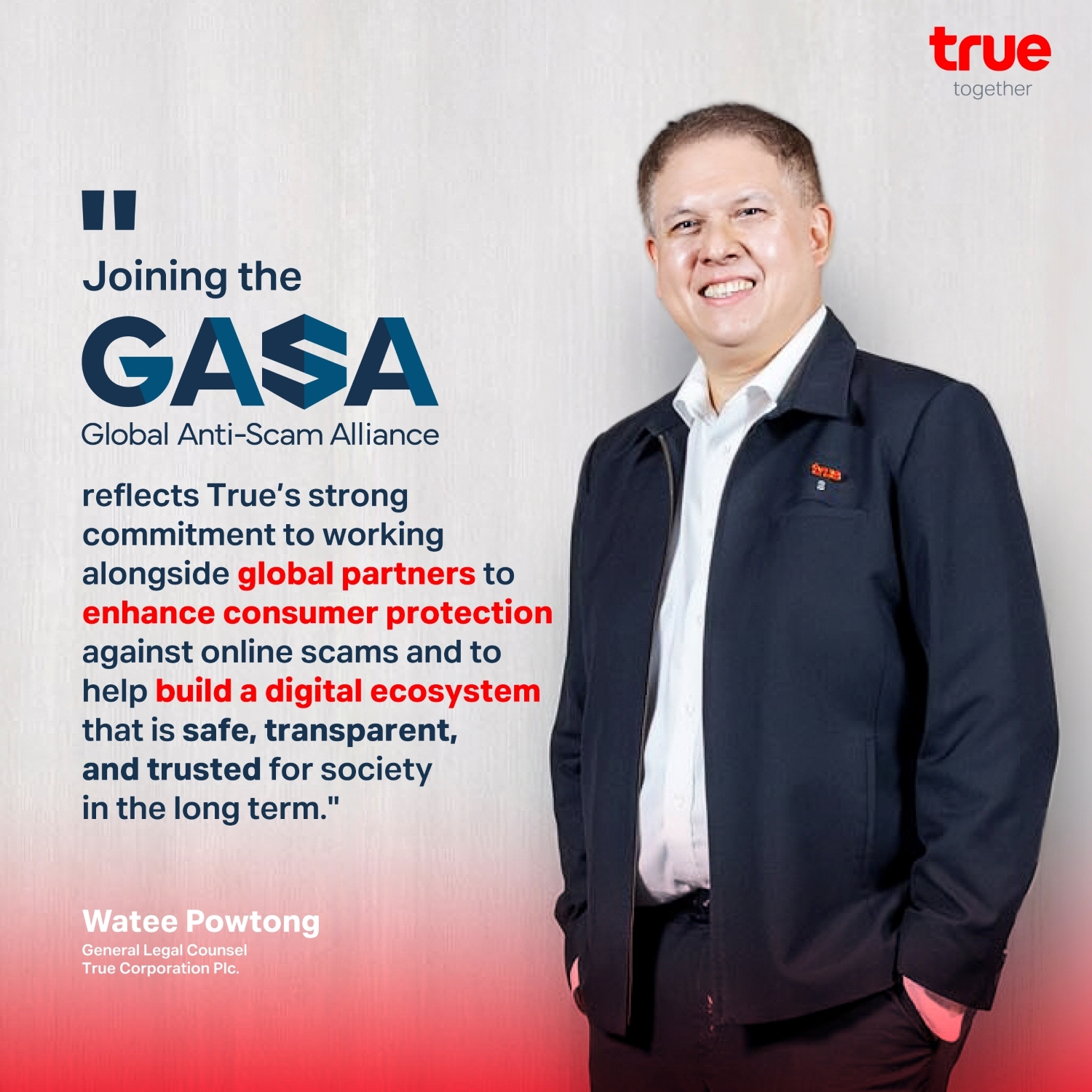 วาที เปาทอง หัวหน้าฝ่ายงานกฎหมาย บมจ. ทรู คอร์ปอเรชั่น กล่าวว่า “การหลอกลวงออนไลน์และภัยจากมิจฉาชีพเป็นความท้าทายระดับโลก ในฐานะผู้นำบริษัทโทรคมนาคม–เทคโนโลยีของไทย ทรู คอร์ปอเรชั่น มีความยินดีอย่างยิ่งที่ได้ร่วมขับเคลื่อนพันธกิจของ Global Anti-Scam Alliance (GASA) ในการปกป้องผู้บริโภคจากภัยหลอกลวง ในยุคที่การเชื่อมต่อกลายเป็นปัจจัยสำคัญในการใช้ชีวิตประจำวัน ความปลอดภัยของผู้คนในโลกดิจิทัลจึงเป็นความรับผิดชอบร่วมกัน ดังนั้น การเชื่อมต่อจึงต้องไม่เพียงสร้างความเชื่อมั่น แต่ยังต้องมีความปลอดภัย โดยใช้เทคโนโลยีขั้นสูงในการป้องกัน ตลอดจนการผสานความร่วมมืออย่างใกล้ชิดในทุกภาคอุตสาหกรรมทั่วโลกอย่างไร้พรมแดน การเข้าร่วมเป็นสมาชิก GASA สะท้อนถึงความมุ่งมั่นของทรูในการทำงานร่วมกับพันธมิตรระดับโลก พร้อมนำประสบการณ์และองค์ความรู้ขององค์กรมาใช้ในการต่อต้านการหลอกลวง และร่วมสร้างระบบนิเวศดิจิทัลที่ปลอดภัยและเชื่อมั่นได้มากยิ่งขึ้นเพื่อสังคมโดยรวม”