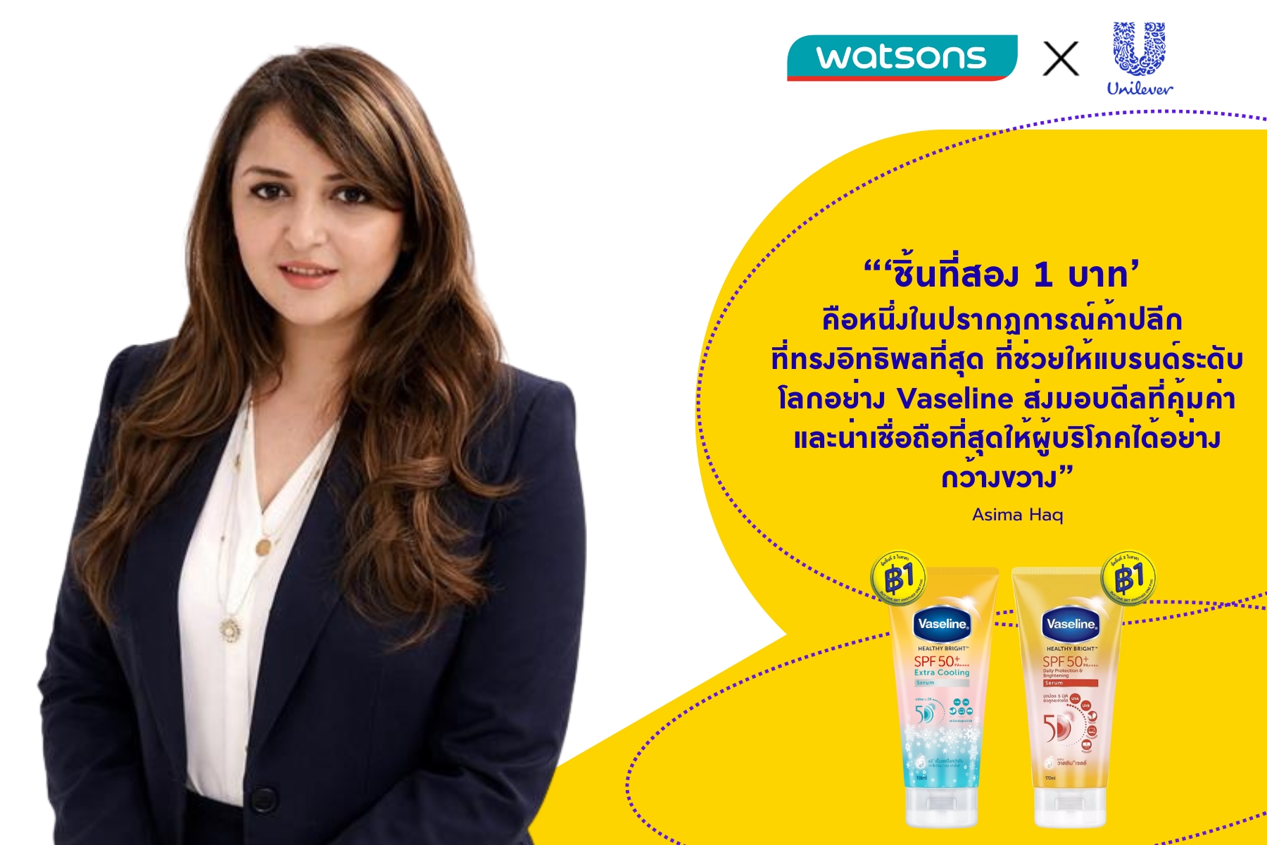 เริ่มต้นที่ยักษ์ใหญ่แห่งวงการความงาม อาสิมา ฮาค (Asima Haq) ผู้อำนวยการการตลาดผลิตภัณฑ์ความงามและสุขภาพ กลุ่มบริษัท ยูนิลีเวอร์ ประเทศไทย กล่าวถึงความร่วมมือครั้งนี้ว่า “สำหรับแบรนด์ Vaseline แคมเปญ ‘ชิ้นที่สอง 1 บาท’ ถือเป็นหนึ่งในโปรโมชันทางการตลาดที่โด่งดังที่สุดประจำปี และเป็นช่วงเวลาที่ผู้บริโภคให้ความสนใจอย่างต่อเนื่อง ดังนั้นการได้ทำงานร่วมกับวัตสันอย่างใกล้ชิด ช่วยให้เราสามารถส่งมอบข้อเสนอที่คุ้มค่าและเข้าถึงผู้บริโภคได้ในวงกว้าง โดยปีนี้เราได้เตรียมสินค้า Hero Product และสินค้าเอ็กซ์คลูซีฟกลุ่มใหม่ๆ มาตอบโจทย์เทรนด์ Health & Beauty ปี 2569 เพื่อให้มั่นใจว่าลูกค้าจะได้รับทั้งความคุ้มค่าและผลิตภัณฑ์ที่มีคุณภาพไปพร้อมกัน”