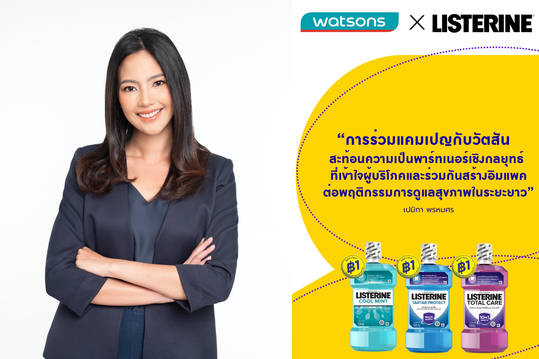 สอดคล้องกับ เปมิกา พรหมศร ผู้อำนวยการฝ่ายขาย ลิสเตอรีน ประเทศไทย ผู้นำผลิตภัณฑ์ดูแลช่องปาก ที่มองเห็นโอกาสในการสร้างสุขอนามัยที่ดีในครั้งนี้ว่า “การเข้าร่วมแคมเปญกับวัตสัน เป็นโอกาสดีที่เราจะได้ขยายฐานลูกค้าและส่งต่อมาตรฐานการดูแลสุขภาพช่องปากให้เข้าถึงคนไทยได้มากขึ้น ผ่าน Hero Product อย่าง Listerine Cool Mint ซึ่งเราเชื่อว่าแรงดึงดูดของแคมเปญนี้ ไม่ใช่เพียงความคุ้มค่า แต่คือการสร้างความเชื่อมั่นว่าลูกค้าจะได้รับสินค้าคุณภาพจากแบรนด์ที่เชื่อถือได้ พร้อมช่วยกระตุ้นให้ผู้บริโภคหันมาดูแลสุขภาพช่องปากอย่างต่อเนื่องและสม่ำเสมอ รับกับเทรนด์การดูแลสุขภาพเชิงป้องกันในปีนี้”
