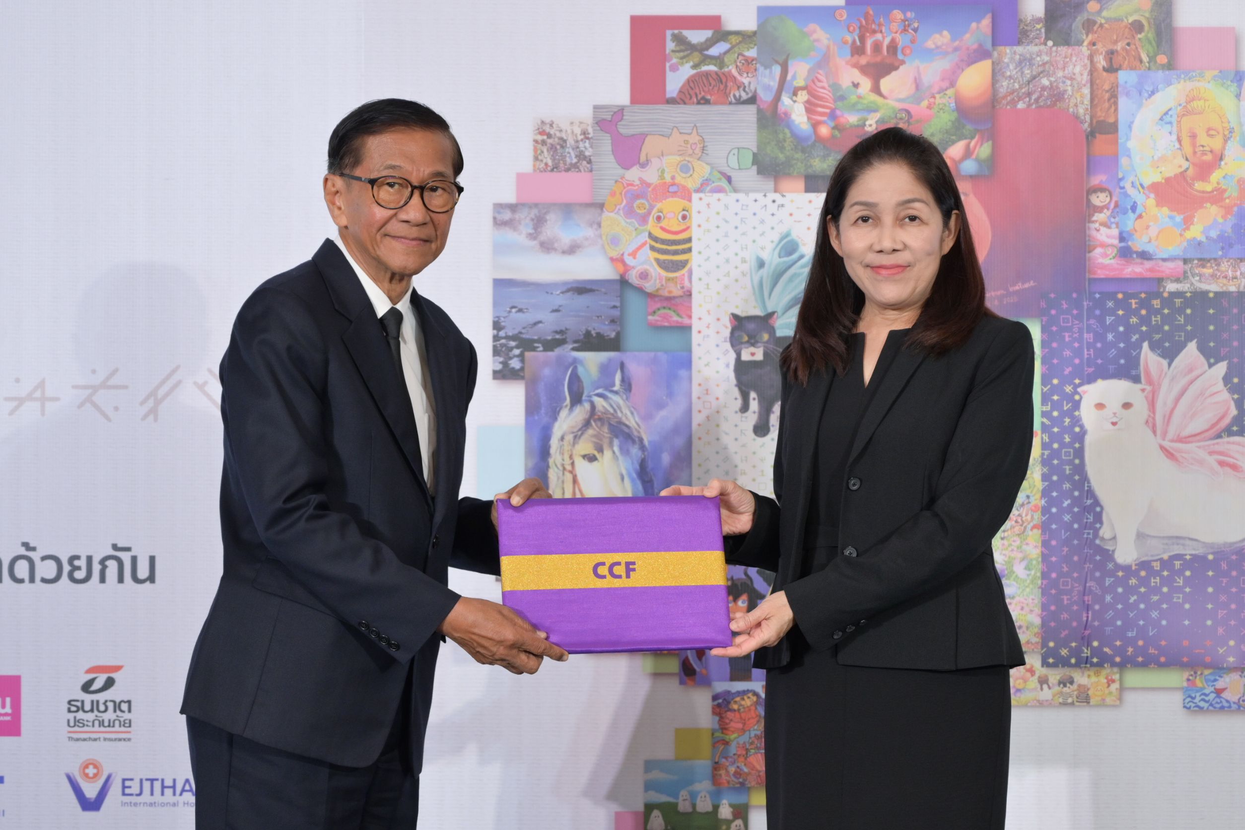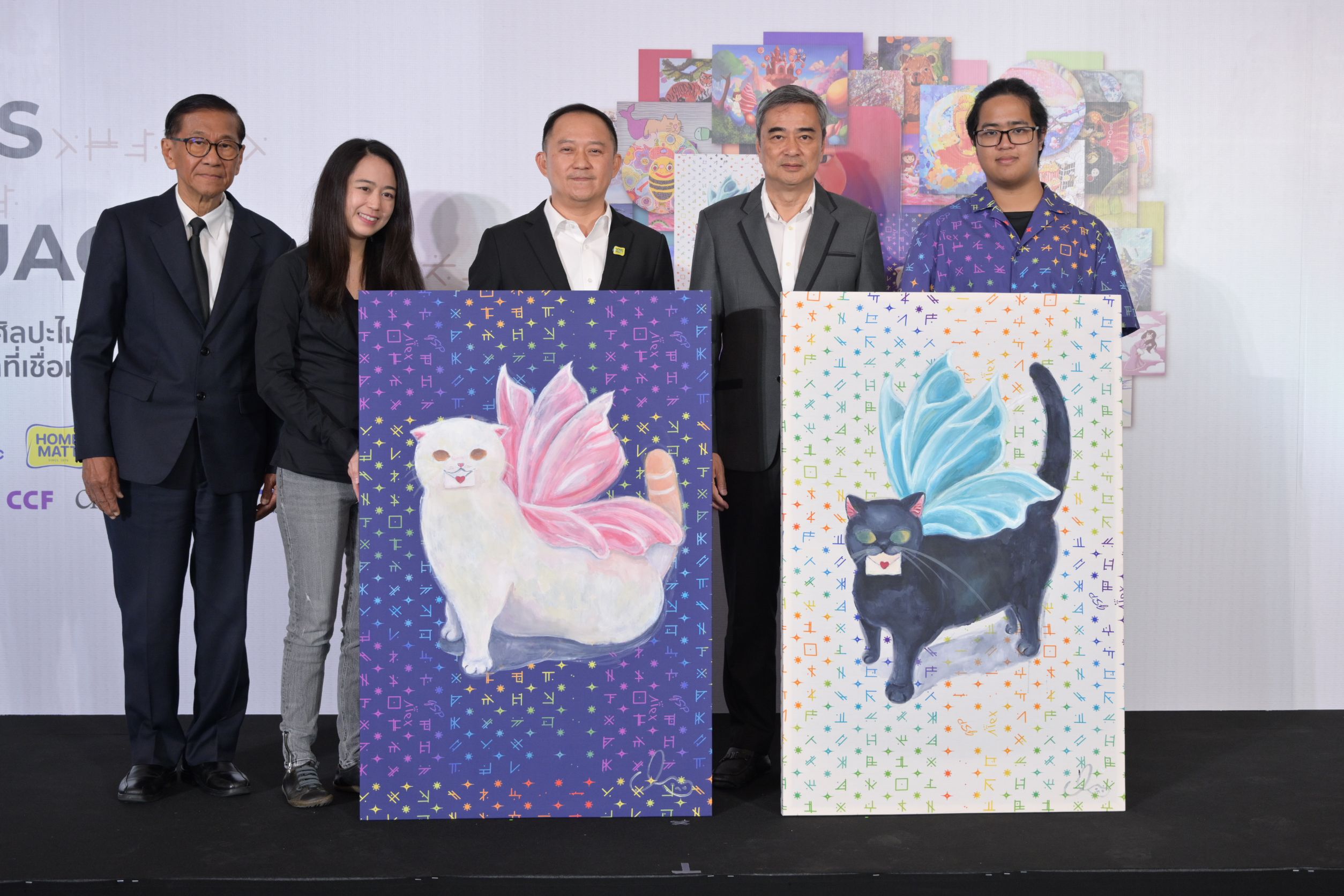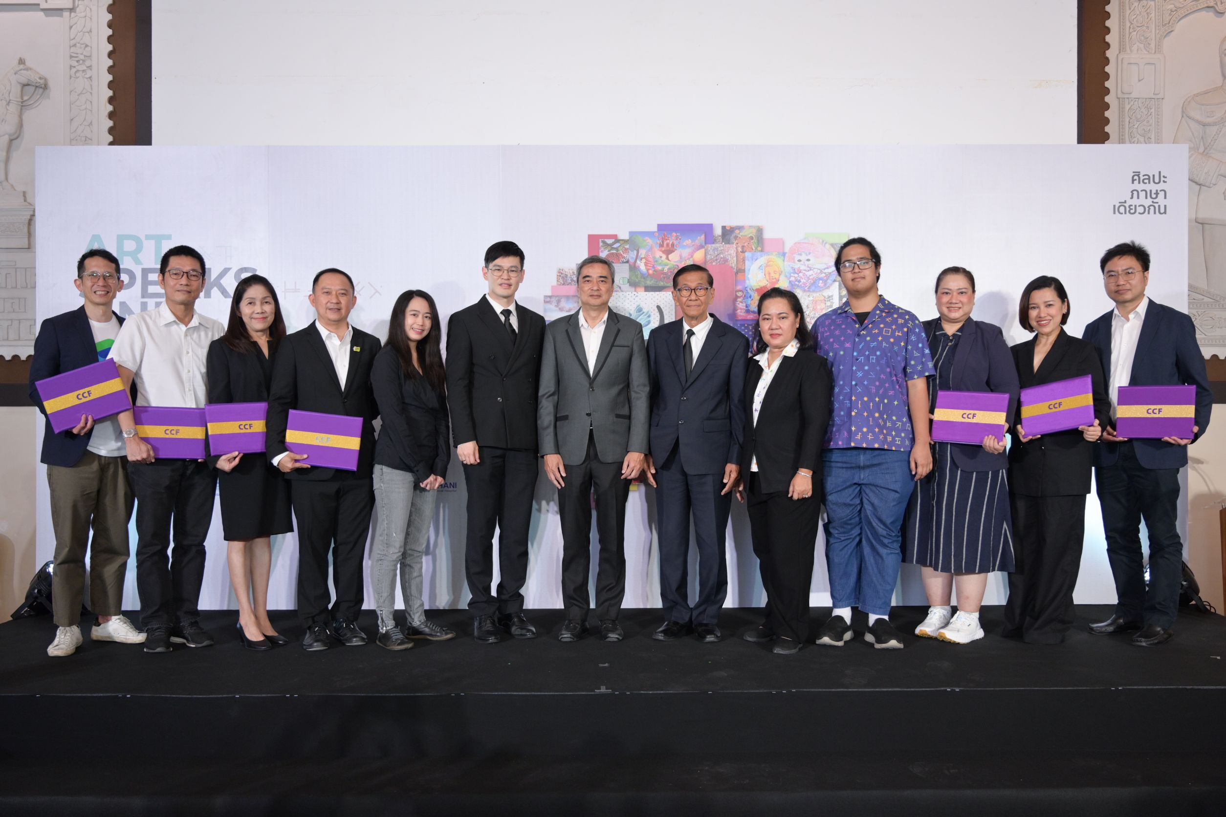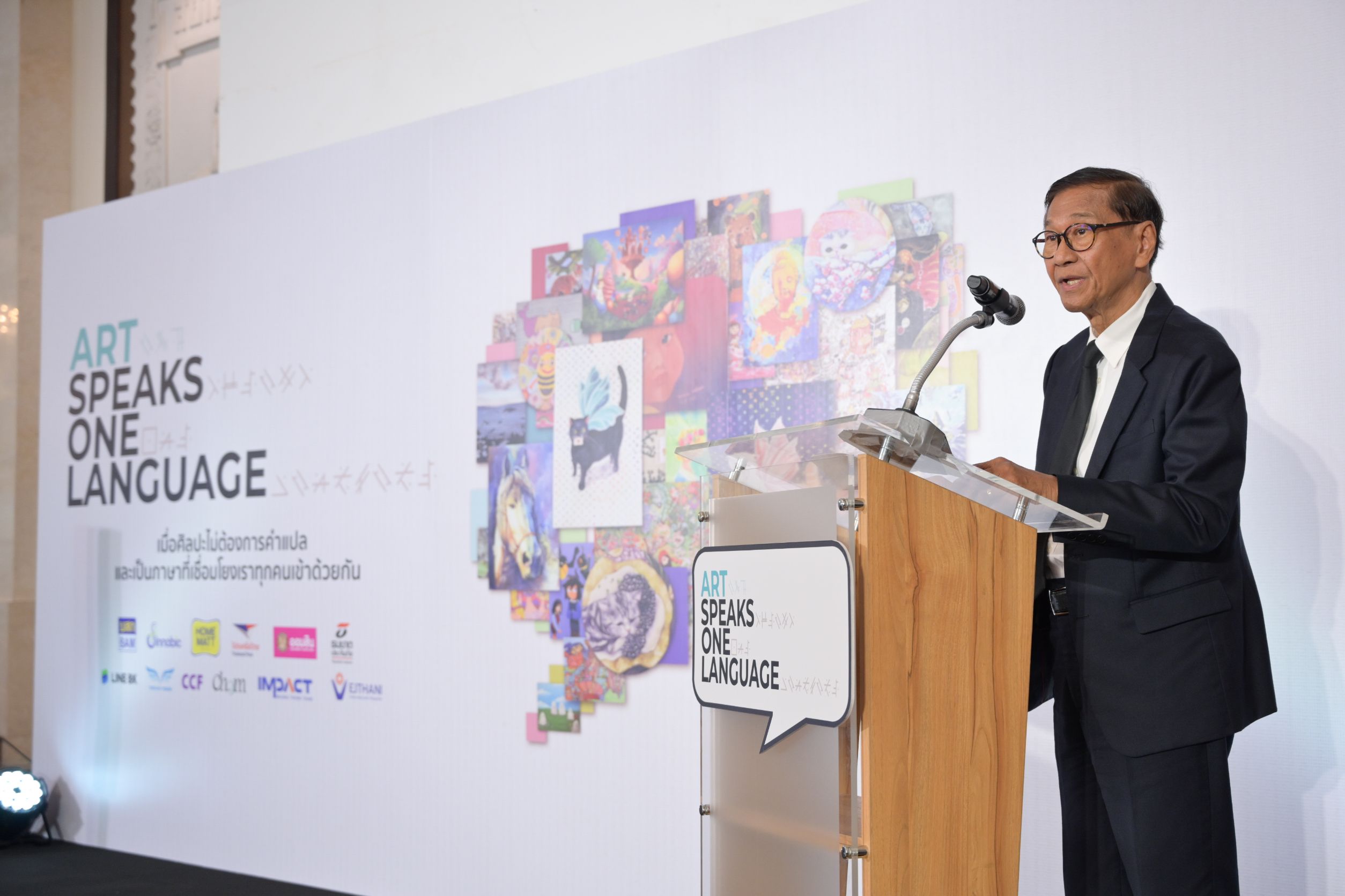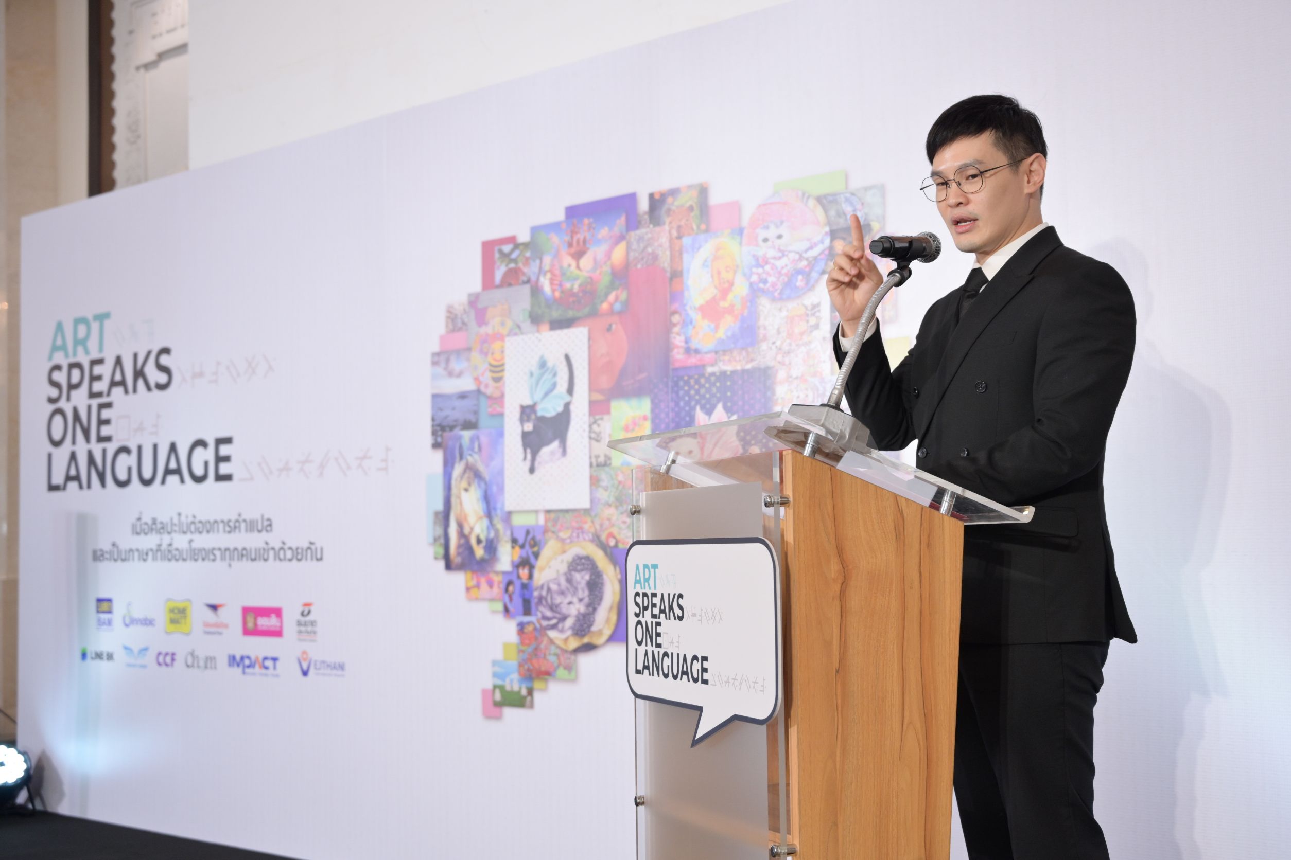 ผศ. ดร.เอกก์ ภทรธนกุล ประธานหลักสูตรวิทยาศาสตรมหาบัณฑิตสาขาการจัดการแบรนด์และการตลาด (ภาษาอังกฤษ) / หัวหน้าภาควิชาการตลาด / อาจารย์ประจำภาควิชาการตลาด จุฬาลงกรณ์มหาวิทยาลัย กรรมการ และประธานกรรมการบริหาร บริษัท ไปรษณีย์ไทย จำกัด กล่าวว่า ไปรษณีย์ไทยรู้สึกยินดีอย่างยิ่งที่ได้ร่วมเป็นส่วนหนึ่งของนิทรรศการ Art Speaks One Language ซึ่งไม่เพียงเป็นการจัดแสดงผลงานศิลปะ แต่คือพื้นที่เชื่อมโยงหัวใจของเด็กพิเศษ ศิลปิน และคนในสังคมเข้าด้วยกัน ไปรษณีย์ไทยในฐานะองค์กรที่ทำหน้าที่เชื่อมโยงผู้คน ความคิด และโอกาส พร้อมส่งต่อรายได้จากการจำหน่ายผลงานศิลปะไปสนับสนุนการพัฒนาห้องเรียนศิลปะให้เด็กยากไร้ผ่านมูลนิธิซี.ซี.เอฟ.ฯ เพื่อร่วมสร้างสังคมที่เท่าเทียมและยั่งยืน
