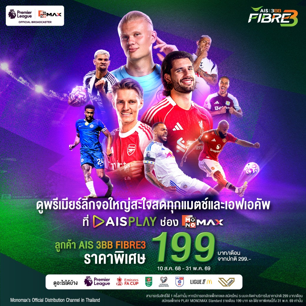 สามารถสมัครแพ็กเกจเสริมดูฟุตบอลพรีเมียร์ลีกทุกแมตซ์และเอฟเอคัพ ราคาพิเศษเพียง 199 บาท / เดือน (ปกติ 299 บาท / เดือน) เมื่อสมัครเน็ตบ้าน AIS 3BB FIBRE3 แพ็กเกจใดก็ได้ เงื่อนไขเป็นไปตามที่บริษัทกำหนด ตั้งแต่วันนี้ - วันที่ 31 พ.ค. 69 หรือดูรายละเอียดเพิ่มเติมได้ที่ https://www.ais.th/consumers/fibre/package/premier/general
