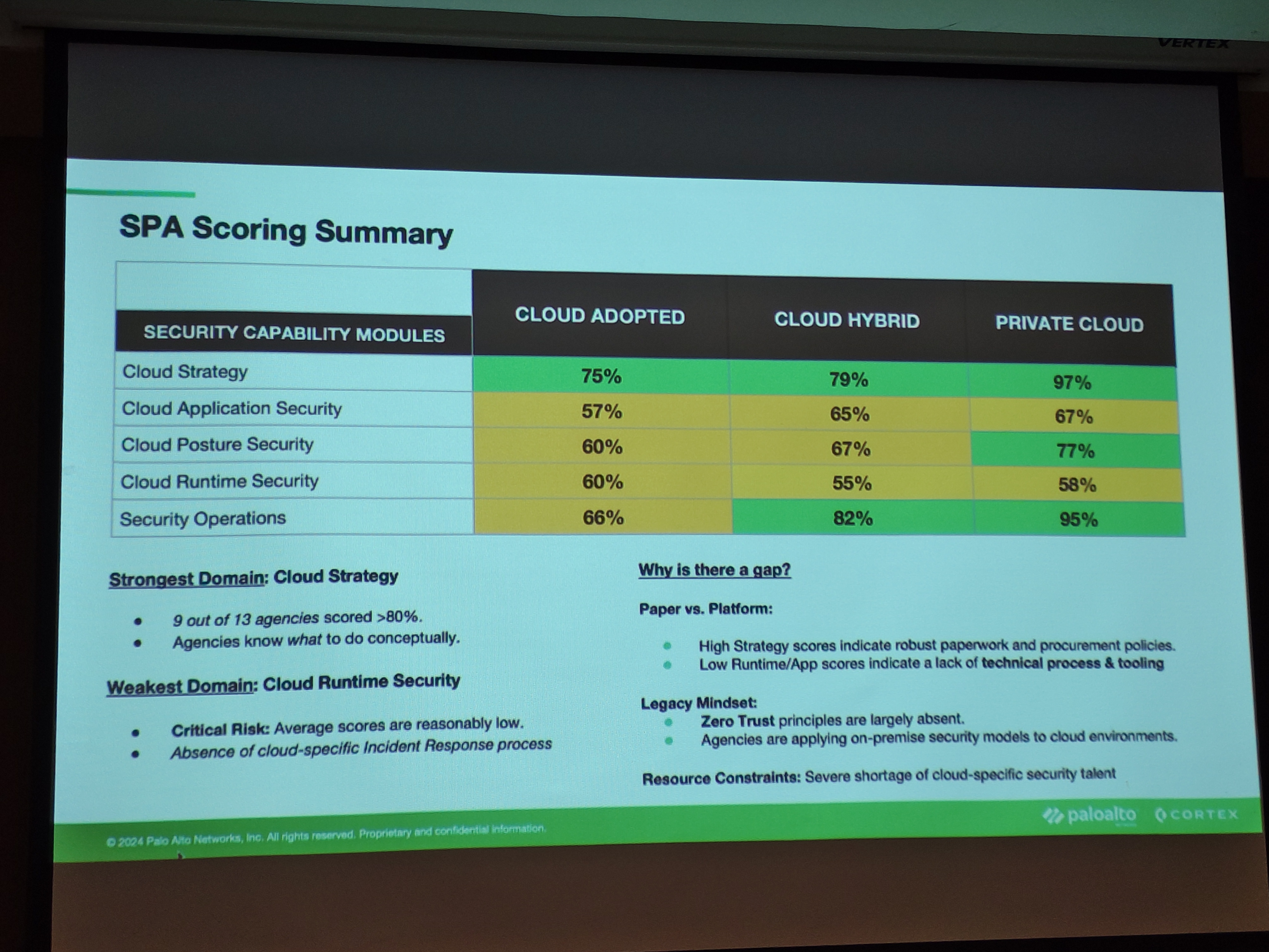 1.จุดแข็งด้านกลยุทธ์: หน่วยงานไทยทำคะแนนได้สูงถึง 84% ในด้านกลยุทธ์คลาวด์ (Cloud Strategy) และ 82% ในด้านศูนย์ปฏิบัติการด้านความปลอดภัย (Security Operations) แสดงให้เห็นว่าภาครัฐมีแผนงานที่ชัดเจน