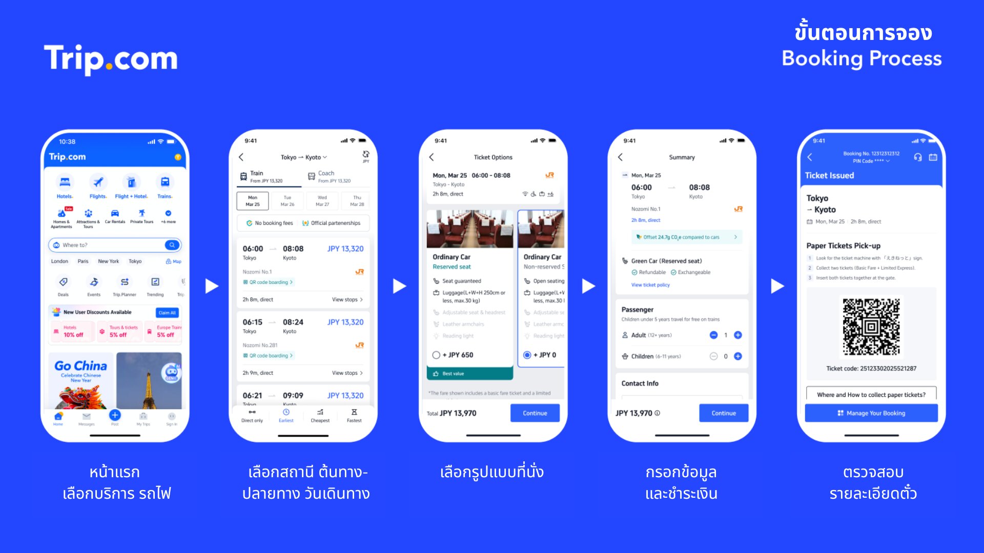 ด้วยบริการดังกล่าว นักเดินทางสามารถเลือกสถานีต้นทางและปลายทาง วันเดินทาง ขบวนรถ และประเภทที่นั่งได้ตามความต้องการ ไม่ว่าจะเป็นที่นั่งแบบไม่ระบุที่นั่ง (Non-reserved) ที่นั่งแบบระบุที่นั่ง (Reserved) หรือที่นั่งชั้นพิเศษ Green Car พร้อมชำระเงินและรับตั๋วผ่านระบบออนไลน์ของ Trip.com