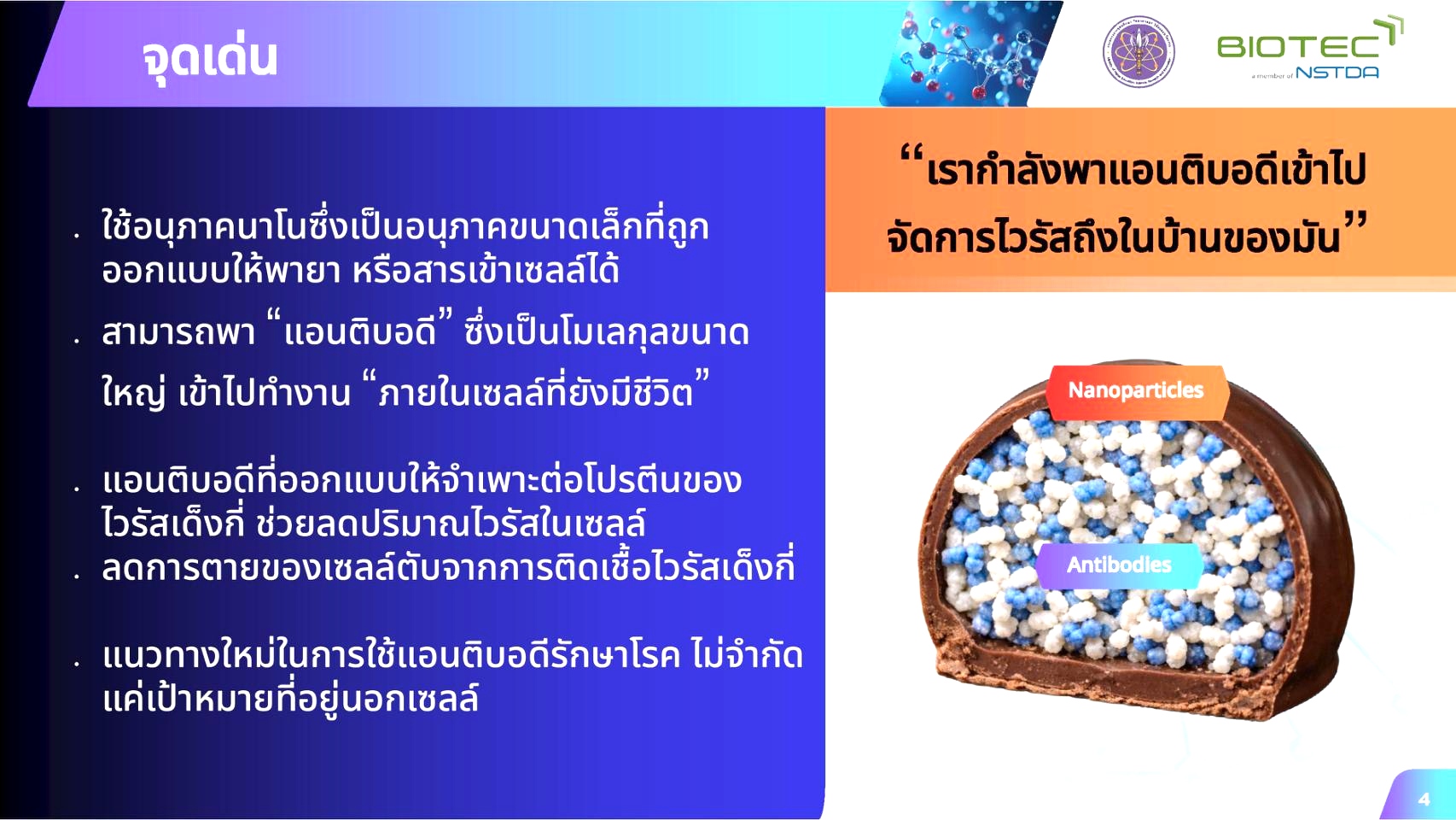 ดร.ร่มฉัตร ไกรว่อง นักวิจัยจากทีมวิจัยชีววิทยาโมเลกุลของไวรัสเด็งกี่และฟลาวิไวรัส กลุ่มวิจัยเทคโนโลยีชีวภาพระดับโมเลกุลทางการแพทย์ ศูนย์พันธุวิศวกรรมและเทคโนโลยีชีวภาพแห่งชาติ (ไบโอเทค) สำนักงานพัฒนาวิทยาศาสตร์และเทคโนโลยีแห่งชาติ (สวทช.) ในฐานะหัวหน้าโครงการวิจัยเรื่อง “การนำส่งแอนติบอดีที่จำเพาะต่อโปรตีนของไวรัสเด็งกี่เข้าสู่เซลล์โดยใช้อนุภาคนาโนชนิดโพลีเมอร์ (Investigation of Dengue-infected Cells Treated with Antibody-Nanoparticles: Host and Viral Views)” พร้อมด้วย ผศ.ดร.นิสา ปฏิการมณฑล นักวิจัยร่วมในโครงการ อาจารย์ประจำภาควิชาเทคโนโลยีชีวภาพ คณะวิทยาศาสตร์ มหาวิทยาลัยมหิดล ได้นำเสนอความก้าวหน้าของงานวิจัย โดยงานวิจัยนี้มุ่งพัฒนาระบบอนุภาคนาโนชนิดโพลีเมอร์สำหรับนำส่งแอนติบอดีที่จำเพาะต่อเชื้อไวรัสเด็งกี่เข้าสู่เซลล์มนุษย์โดยตรง เพื่อเพิ่มประสิทธิภาพและความแม่นยำในการรักษาโรคไข้เลือดออก