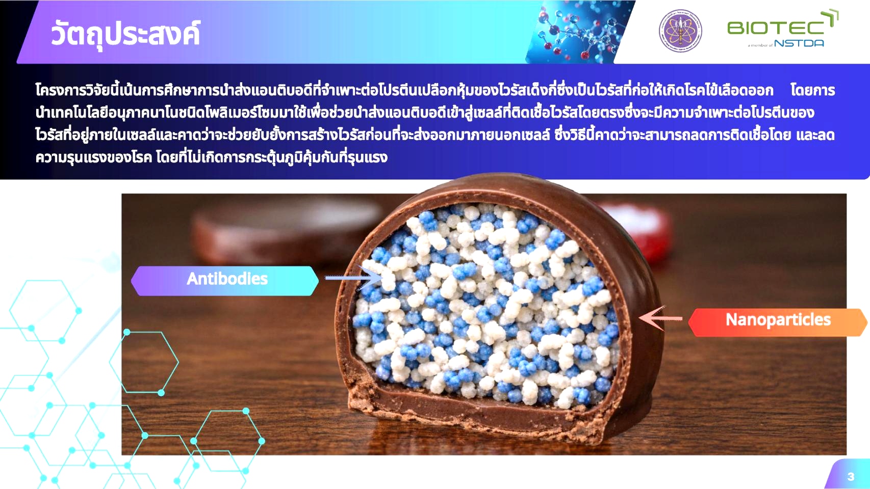 โครงการวิจัยพัฒนาเทคโนโลยีอนุภาคนาโนสำหรับนำส่งแอนติบอดีเพื่อการรักษาโรคไข้เลือดออกของไทย ได้รับการคัดเลือกภายใต้กรอบทศวรรษสากลแห่งวิทยาศาสตร์เพื่อการพัฒนาอย่างยั่งยืนขององค์การยูเนสโก (UNESCO’s International Decade of Sciences for Sustainable Development) สะท้อนบทบาทของประเทศไทยในการขับเคลื่อนองค์ความรู้ทางวิทยาศาสตร์เพื่อแก้ไขปัญหาสุขภาพระดับโลก พร้อมเสริมสร้างความมั่นคงด้านสุขภาพของประเทศ