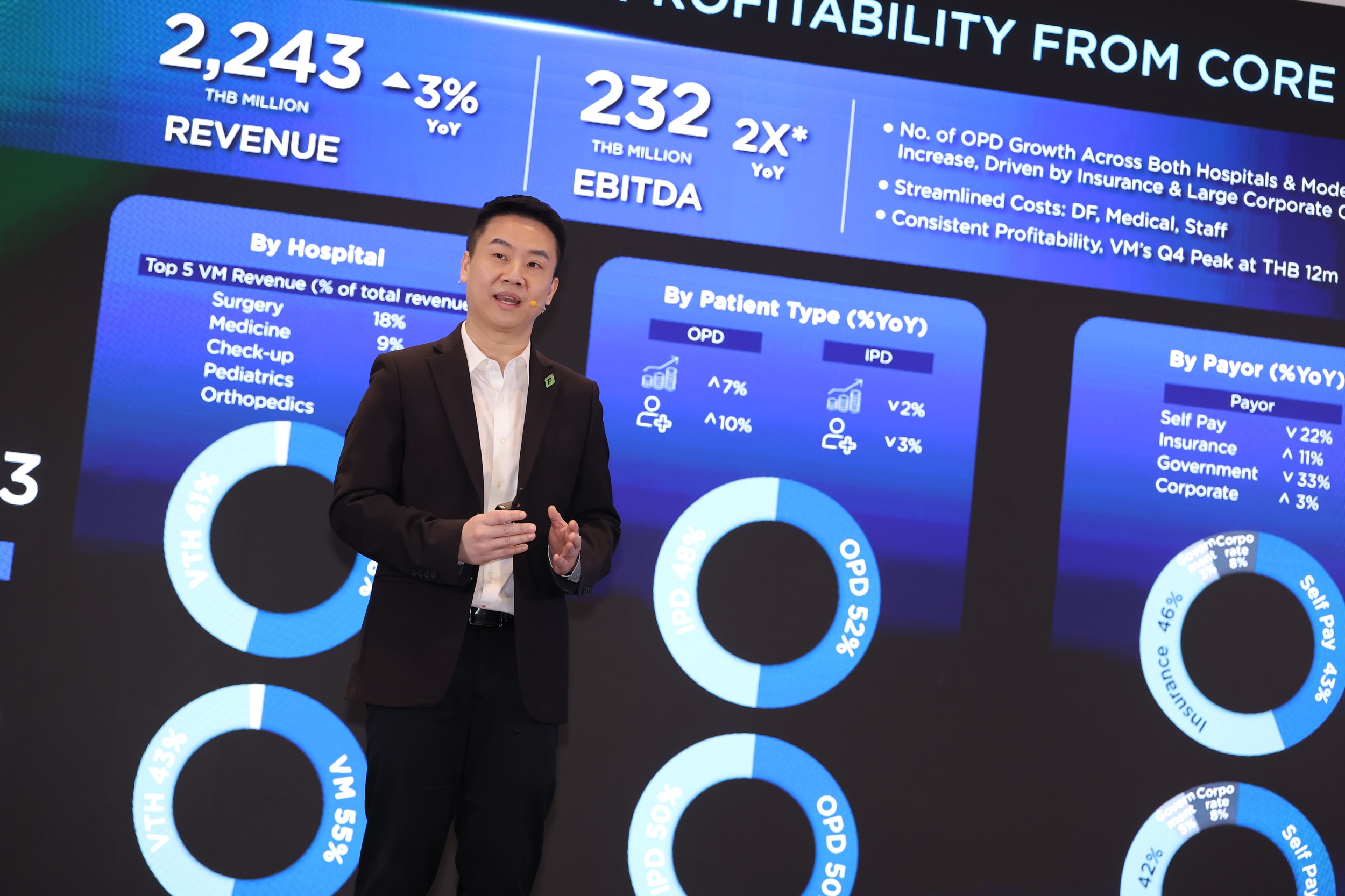 นายแพทย์นิพัฒน์ กุหลาบขาว ประธานเจ้าหน้าที่บริหาร บริษัท โรงพยาบาลวิมุต โฮลดิ้ง จำกัด กล่าวเสริมว่า ธุรกิจโรงพยาบาลในเครือวิมุตเติบโตได้อย่างต่อเนื่องในปี 2568 โดยมีรายได้รวม 2,243 ล้านบาท เพิ่มขึ้นจากปีก่อนหน้า 3% และมีกำไรจากการดำเนินงาน (EBITDA) 232 ล้านบาท เติบโตเท่าตัว โดยโรงพยาบาลวิมุต พหลโยธิน เริ่มทำกำไรรายไตรมาสได้กว่า 12 ล้านบาท และในเดือนธันวาคม 2568 มีอัตรากำไรขั้นต้นสูงสุดตั้งแต่ก่อตั้งโรงพยาบาลมา ซึ่งเป็นผลมาจากการขยายการบริการดูแลรักษาในสาขาหลัก เช่น สุขภาพปอด หัวใจและหลอดเลือด และกระดูกและข้อ รวมถึงการเติบโตของลูกค้าประกัน ลูกค้าองค์กร และการเติบโตของกลุ่มผู้ป่วยต่างชาติ ทั้งเมียนมา (เติบโตขึ้น 10 เท่า) กลุ่มอาหรับ (เติบโต 2 เท่า) จีน และแอฟริกา ในช่วงเดือนธันวาคมที่ผ่านมา ในส่วนของโรงพยาบาลวิมุต-เทพธารินทร์ นอกจากความเป็นผู้นำด้านการป้องกันและรักษาผู้ป่วยเบาหวาน ไทรอยด์ และต่อมไร้ท่อแล้ว ยังสามารถสร้างรายได้เพิ่มจากการโปรโมทศูนย์ตรวจสุขภาพและยกระดับการดูแลสุขภาพเชิงป้องกัน กับบริษัทขนาดใหญ่โดยรอบและลูกบ้านพฤกษา เพื่อให้เข้าถึงการรักษาพยาบาลได้ง่ายขึ้น