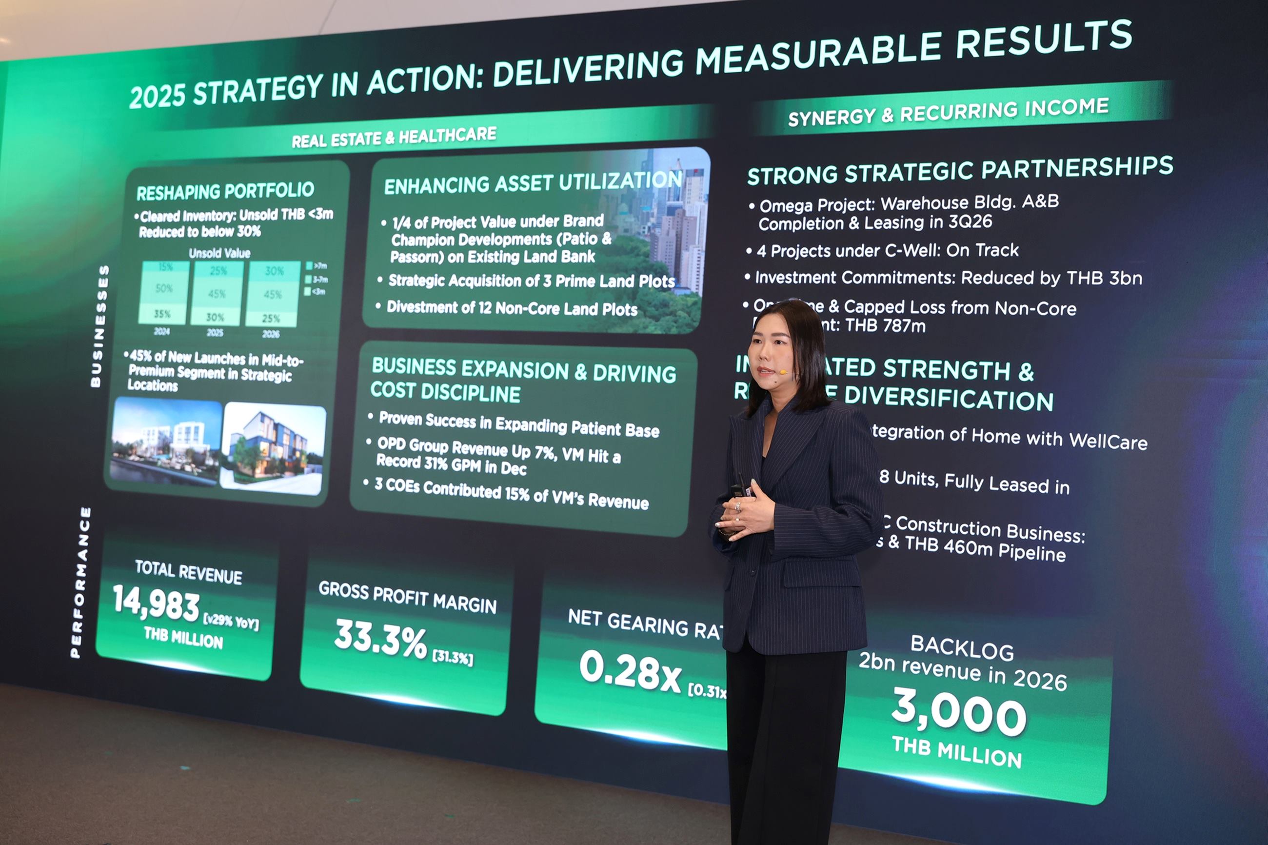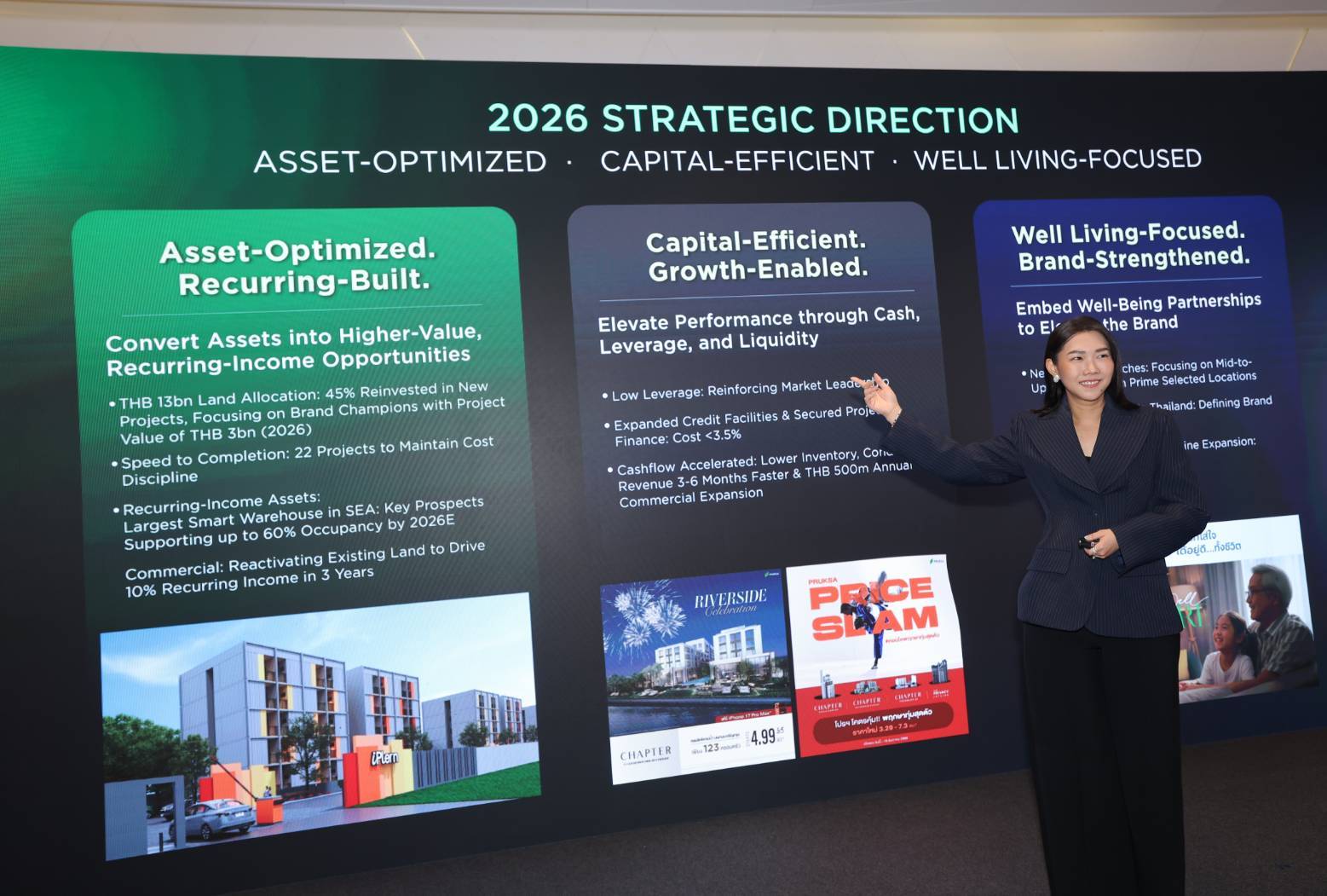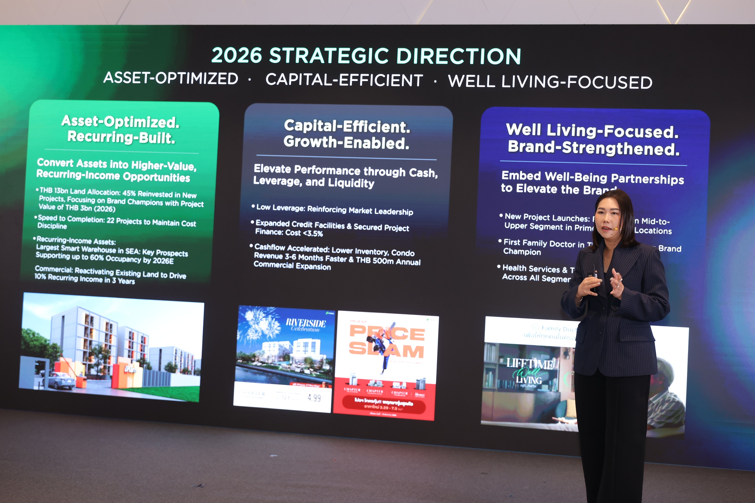 ในมิติแรก “Asset-Optimized, Recurring-Built” บริษัทฯ เดินหน้ากลยุทธ์เชิงรุกเพื่อเพิ่มสัดส่วนรายได้ประจำ (Recurring Income) ผ่านการบริหารจัดการพอร์ตที่ดินมูลค่ากว่า 12,800 ล้านบาท เปลี่ยนสินทรัพย์ให้เป็นรายได้ผ่านการพัฒนาโครงการที่อยู่อาศัยและการสร้างรายได้จากการเช่ารูปแบบใหม่ๆ อาทิ กลุ่มเฮลท์แคร์, อะพาร์ตเมนต์, ไฮบริด เรสซิเด้นท์ และคลังสินค้า พร้อมกันนี้ บริษัทฯ ได้วางโรดแมปเร่งสปีดการพัฒนาและการโอนกรรมสิทธิ์ โดยตั้งเป้าปิดโครงการรวม 22 โครงการ เพื่อเพิ่มประสิทธิภาพการบริหารจัดการต้นทุนและลดภาระในการดูแลสินค้าคงคลังอย่างเป็นระบบ สำหรับความคืบหน้าในธุรกิจคลังสินค้า “โอเมก้า บางนา โลจิสติกส์ แคมปัส” ซึ่งเป็นคลังสินค้าอัจฉริยะบนพื้นที่กว่า 217,000 ตารางเมตร ที่ถือเป็นหนึ่งในคลังสินค้าขนาดใหญ่ที่สุดในภูมิภาคเอเชียตะวันออกเฉียงใต้ โดยพัฒนาร่วมกับพันธมิตรระดับโลก เพื่อรองรับศักยภาพด้านโลจิสติกส์ การกระจายสินค้า และสอดรับกับแนวโน้มเศรษฐกิจยุคใหม่ บริษัทฯ จะเริ่มรับรู้รายได้ในไตรมาส 3 พร้อมได้รับความเชื่อมั่นจากพันธมิตรรายใหญ่ในกลุ่มโลจิสติกส์และอีคอมเมิร์ช โดยคาดว่าจะมียอดจองพื้นที่กว่า 60% ขณะเดียวกันบริษัทฯ ได้นำที่ดินจากพอรต์ที่มีอยู่มาพัฒนาโครงการ และเพิ่มสัดส่วนบ้านในเซ็กเมนต์กลางถึงบน เพื่อสร้างกระแสเงินสดหมุนเวียน สำหรับรองรับการขยายตัวของธุรกิจในอนาคตได้อย่างมีประสิทธิภาพ