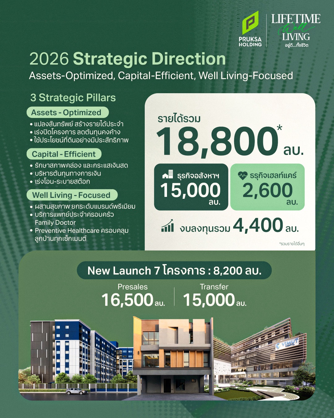 พฤกษา โฮลดิ้ง โชว์การปรับตัวเชิงกลยุทธ์ท่ามกลางความผันผวนของตลาด สะท้อนความสำเร็จของกลยุทธ์ Reshaping Portfolio ในปี 2568 จากการปรับพอร์ตโฟลิโอสู่ตลาดระดับกลางถึงบน ลดสัดส่วนธุรกิจที่ไม่ใช่แกนหลัก และยกระดับคุณภาพโครงการให้สอดรับกับกำลังซื้อ ส่งผลให้บริษัทฯ สามารถรักษาอัตรากำไรขั้นต้น (GPM) ได้สูงถึง 33.3% จากรายได้รวม 14,983 ล้านบาท ท่ามกลางภาวะตลาดที่ผันผวน ตอกย้ำประสิทธิภาพการบริหารพอร์ตและวินัยทางการเงินอย่างเป็นรูปธรรม พร้อมเปิดฉากปี 69 ด้วยกลยุทธ์ใหม่ภายใต้กรอบ “Asset-Optimized, Capital-Efficient, Well Living-Focused” มุ่งเปลี่ยนสินทรัพย์ให้เป็นโอกาสเพื่อสร้างรายได้ระยะยาว บริหารเงินทุนอย่างมีวินัย ยกระดับแบรนด์ผ่านความร่วมมือด้านสุขภาพและบริการครบวงจร ตั้งเป้าปี 69 กวาดรายได้ 18,800 ล้านบาท ธุรกิจเรียลเอสเตท เตรียมเปิดตัว 7 โครงการใหม่ มูลค่ารวม 8,200 ล้านบาท ดันรายได้ 15,000 ล้านบาท ส่วนธุรกิจ เฮลท์แคร์เครือวิมุตลุยเดินหน้ากลยุทธ์ความเป็นเลิศ ปักธงสร้างรายได้ 2,600 ล้านบาท