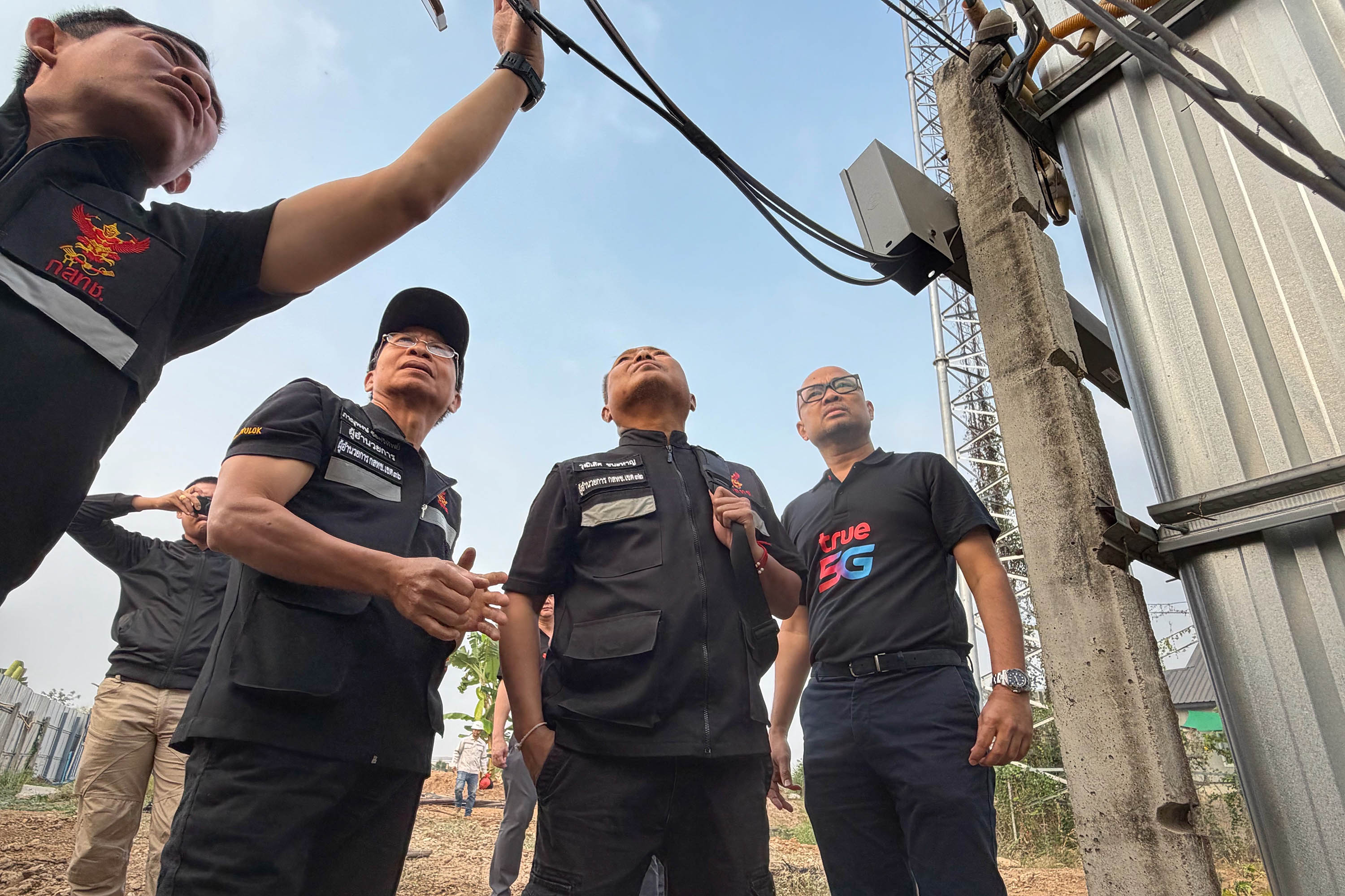 บรรยายภาพ: ภัคพงศ์ พัฒนมาศ ที่ปรึกษาด้านรัฐกิจสัมพันธ์ บริษัท ทรู คอร์ปอเรชั่น จำกัด (มหาชน) ตัวแทนบริษัทฯ ร่วมกับ พ.ต.ท.ตฤณ ลีลานุช สารวัตรกลุ่มงานสนับสนุนคดีเทคโนโลยี กองบังคับการปราบปรามการกระทำความผิดเกี่ยวกับอาชญากรรมทางเทคโนโลยี (บก.ปอท.) และสุธีระ พึ่งธรรม ผู้อำนวยการสำนักกำกับดูแลกิจการโทรคมนาคม สำนักงาน กสทช. ปฏิบัติการกวาดล้างจุดลักลอบส่งสัญญาณเน็ตข้ามแดนไทย-เมียนมา และยึดอุปกรณ์ผิดกฎหมายที่จุดต้องสังสัย ตำบลแม่ตาว อำเภอแม่สอด จังหวัดตาก ภายใต้กรอบกฎหมายที่เกี่ยวข้อง