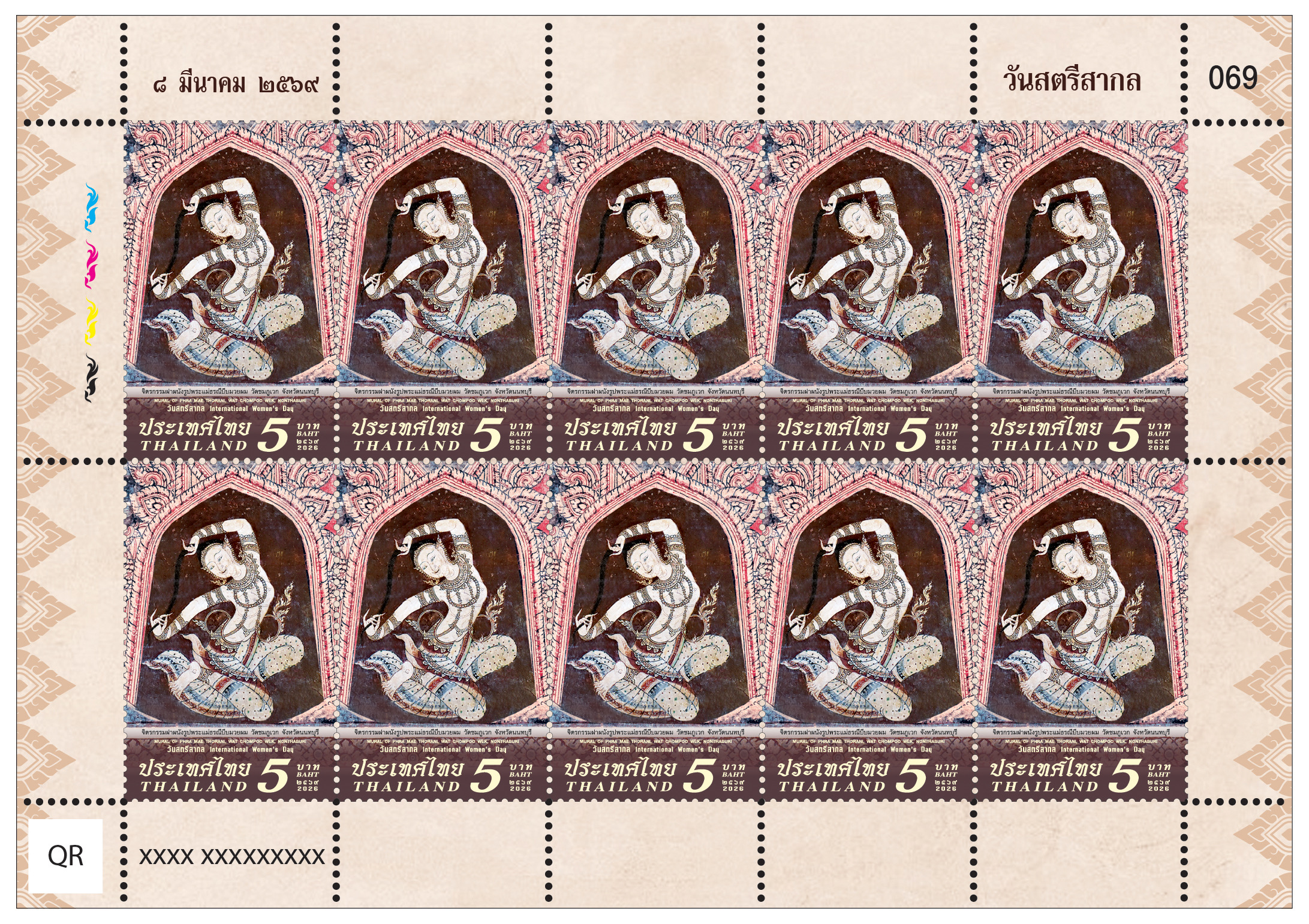 สำหรับแสตมป์ที่ระลึกชุดวันสตรีสากล 2569 ได้นำเสนอภาพ “พระแม่ธรณีบีบมวยผม” จากจิตรกรรมฝาผนังพระอุโบสถ วัดชมภูเวก สื่อถึงพลัง ความมั่นคง และคุณค่าผ่านบทบาทของสตรีผ่านสัญลักษณ์ทางศิลปกรรมไทยอันทรงคุณค่า ภาพพระแม่ธรณีในท่วงท่าบีบมวยผมถือเป็นภาพแทนแห่งความเข้มแข็ง การยืนหยัดในความถูกต้อง และการปกป้องคุณธรรม สะท้อนพลังของผู้หญิงที่มีบทบาทสำคัญทั้งในมิติทางศาสนา วัฒนธรรม และสังคม จำหน่ายดวงละ 5 บาท 1 แผ่นมี 10 ดวง ซองวันแรกจำหน่าย 17 บาท สามารถซื้อได้ที่พิพิธภัณฑ์แสตมป์ไทยอาคารปฏิบัติการไปรษณีย์สามเสนใน (BTS สะพานควาย) ไปรษณีย์ในกรุงเทพฯ ไปรษณีย์จังหวัด หรือซื้อทางออนไลน์ที่เว็บไซต์ https://www.thailandpostmart.com และแอปพลิเคชัน ThailandPostMart