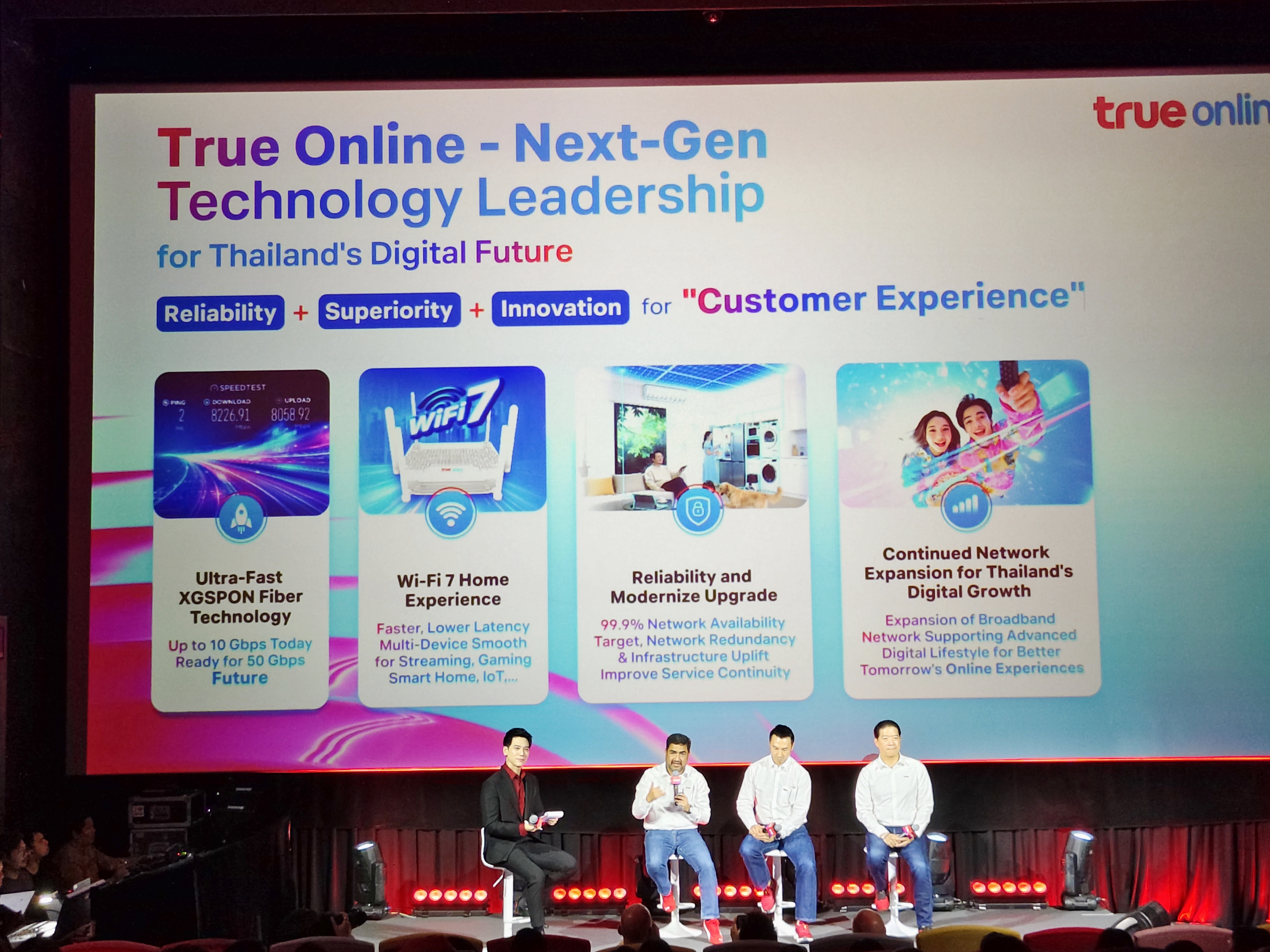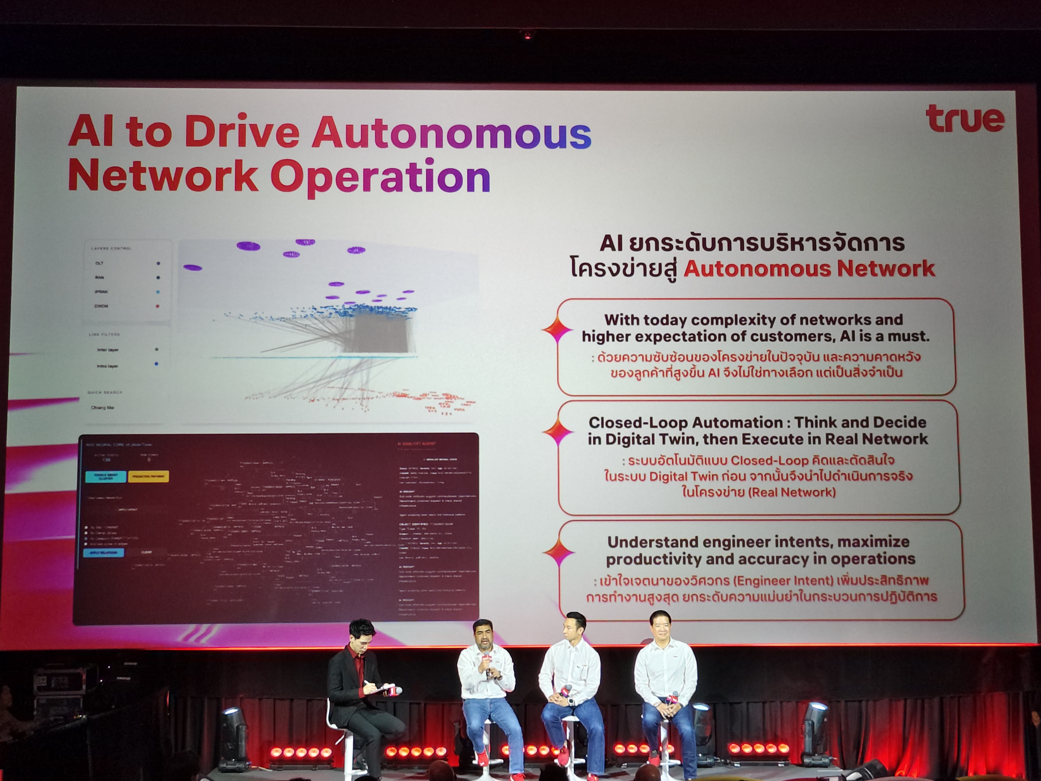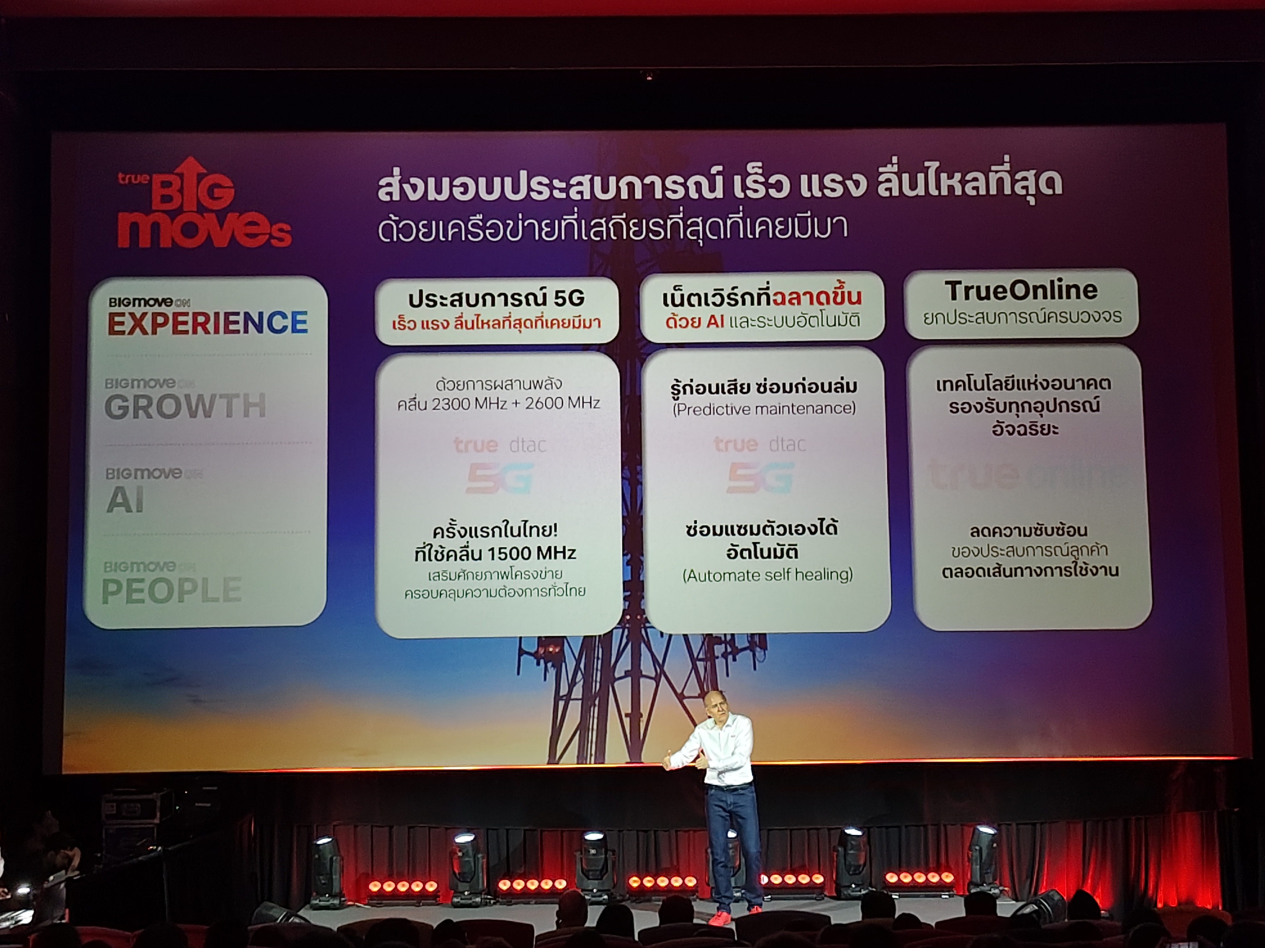 ทรูมุ่งเน้นการสร้างประสบการณ์ลูกค้าแบบ End-to-End ผ่านโครงสร้างพื้นฐานดิจิทัลที่ล้ำสมัย โดยมีไฮไลท์สำคัญคือการทำ Network Refarming บนคลื่นความถี่ 2300 MHz, 2600 MHz และการเป็นรายแรกในไทยที่นำคลื่น 1500 MHz มาใช้งานเพื่อเพิ่มความเร็วและความจุของสัญญาณ